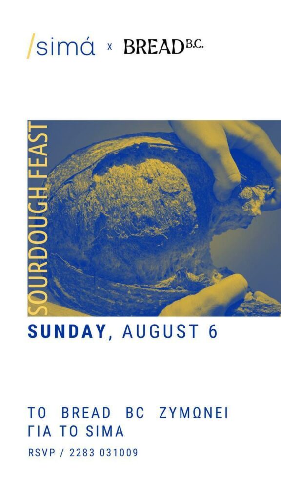 Η Κυριακή 6 Αυγούστου είναι αφιερωμένη στη διαδικασία της ζύμωσης. Ο ξεχωριστός φούρνος του Χαλανδρίου και το γνωστό μπακαλομπάρ Simá στον Πύργο της Τήνου συναντιούνται σε ένα ενδιαφέρον event. Από το απόγευμα ως το βράδυ το Bread BC θα ετοιμάζει προζυμένια ψωμιά και άλλες λιχουδιές όπως προπύρα (είδος φοκάτσιας από τη Λακωνία), ενώ το Simá θα βάλει τα κρασιά και τα τυριά.