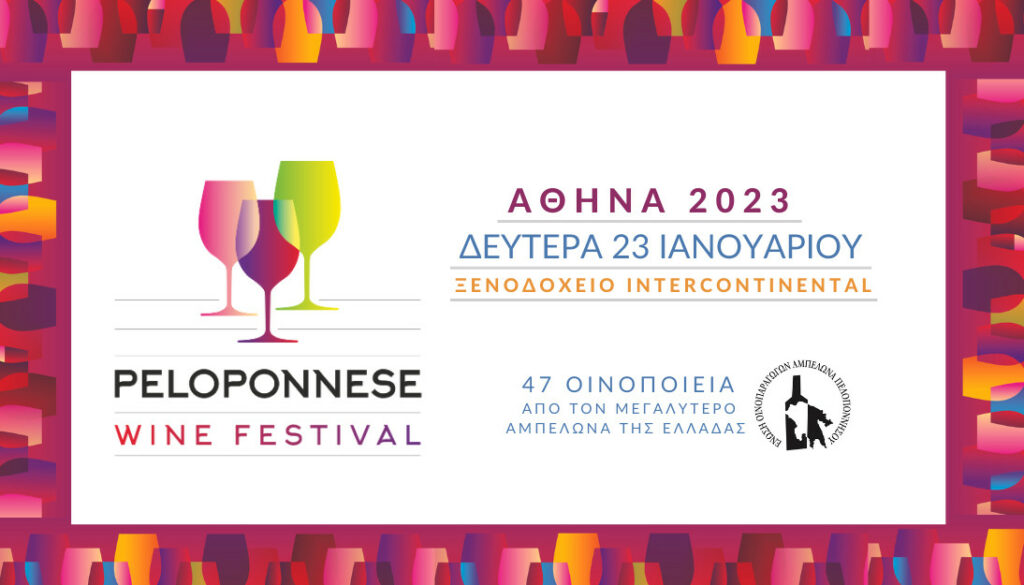 Το Peloponnese Wine Festival, η εκδήλωση γευσιγνωσίας των Wines of Peloponnese έρχεται τη Δευτέρα 23 Ιανουαρίου 2023 στο ξενοδοχείο Athenaeum Intercontinental. 47 παραγωγοί, μέλη της Ένωσης Οινοπαραγωγών Αμπελώνα Πελοποννήσου (ΕΝΟΑΠ), θα δώσουν δυναμικό παρών και θα υποδεχτούν το οινόφιλο κοινό και τους επαγγελματίες, με περισσότερες από 500 διαφορετικές ετικέτες κρασιών.