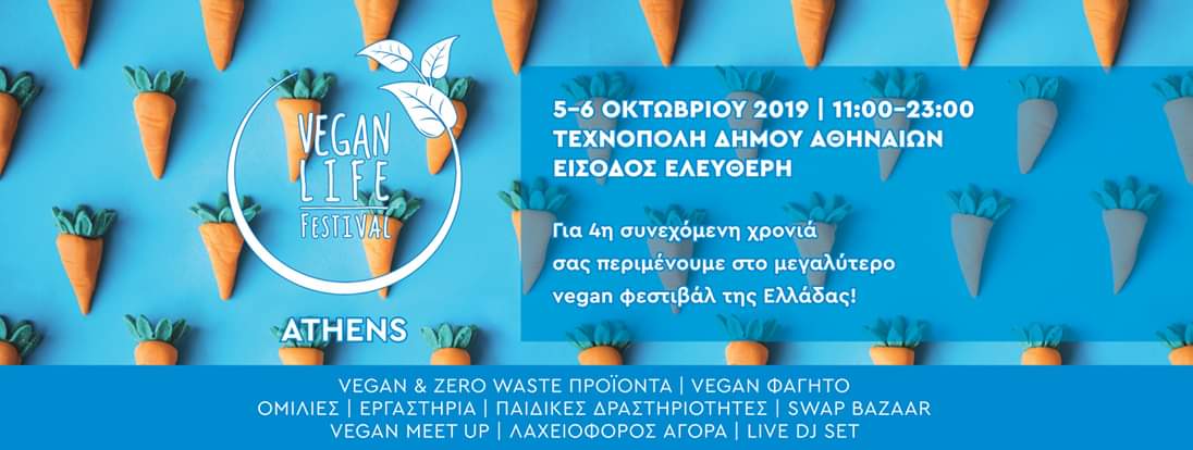 Το 4ο Vegan Life Festival της Αθήνας πρόκειται να πραγματοποιηθεί στις 5 και 6 Οκτωβρίου 2019, στην Τεχνόπολη Δήμου Αθηναίων, από τις 11:00 το πρωί μέχρι τις 11:00 το βράδυ.