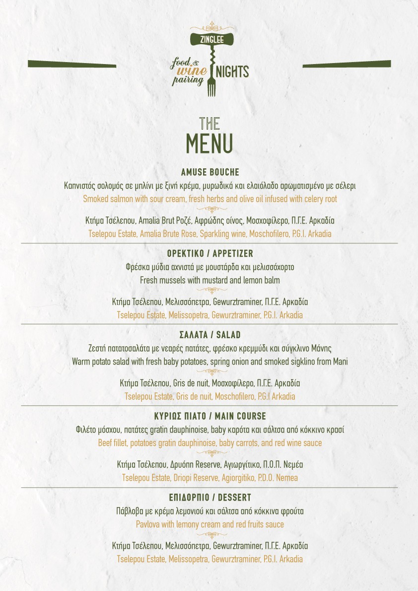 Την Τετάρτη 19 Φεβρουαρίου το Zinglee, υποδέχεται το Κτήμα Τσέλεπου σε μια βραδιά που συνδυάζει απολαυστικά τους εκλεκτούς οίνους της Πελοποννήσου και εξαιρετικές γεύσεις.