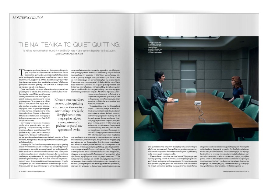 Στη θεματολογία του τεύχους μας απασχολεί το quiet quitting (είναι το τέλος της εργασιοµανίας ή η νέα φυγοπονία;)