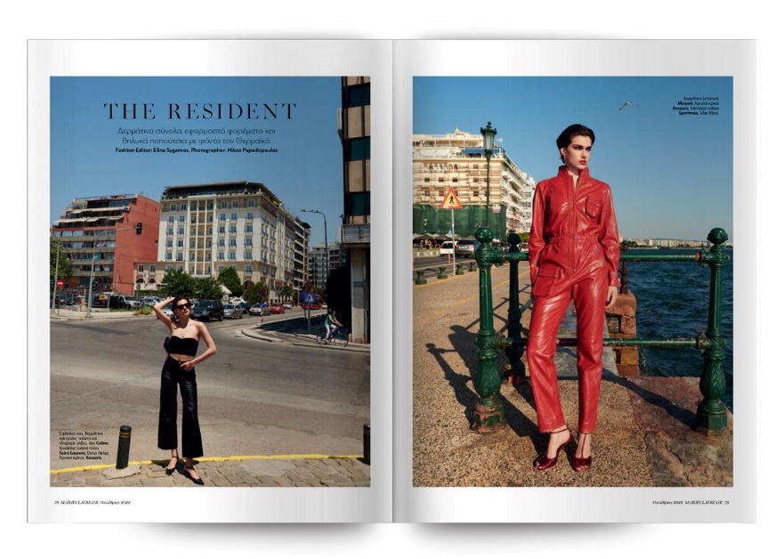 και δοκιμάζει δερµάτινα σύνολα, εφαρµοστά φορέµατα και θηλυκά παπούτσια µε φόντο τον Θερµαϊκό,