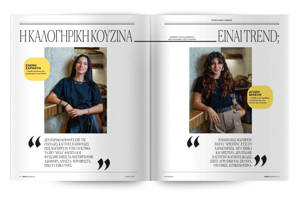 Η Αγάπη Μιχελή, η σεφ στην πρεσβεία της Δανίας και μαγείρισσα στη Λόντζα της γειτονιάς συνομιλεί με την Ελένη Σαράντη, σεφ στο Lost Athens, στην κουζίνα του οποίου εργάζονται μόνον γυναίκες.