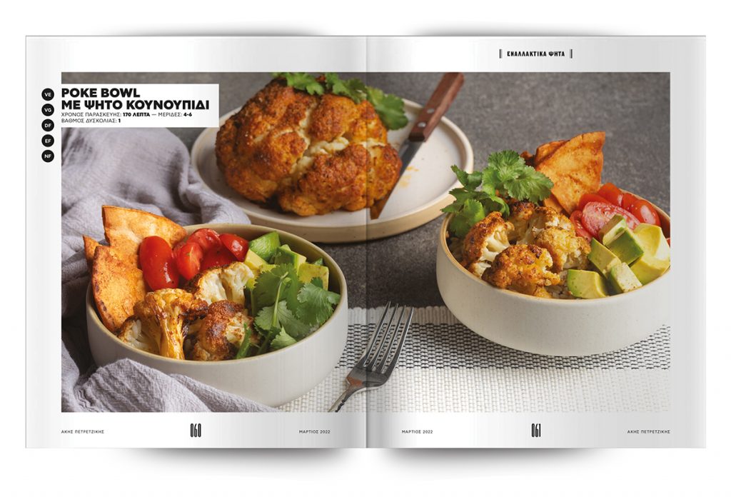 Σουβλάκια από μανιτάρια και Tofu με ταμπουλέ, Poke bowl με ψητό κουνουπίδι, vegan γύρος από σελινοριζα, seitan με ρύζι, μπιφτέκια από πλιγούρι και παντζάρια με πατάτες φούρνου