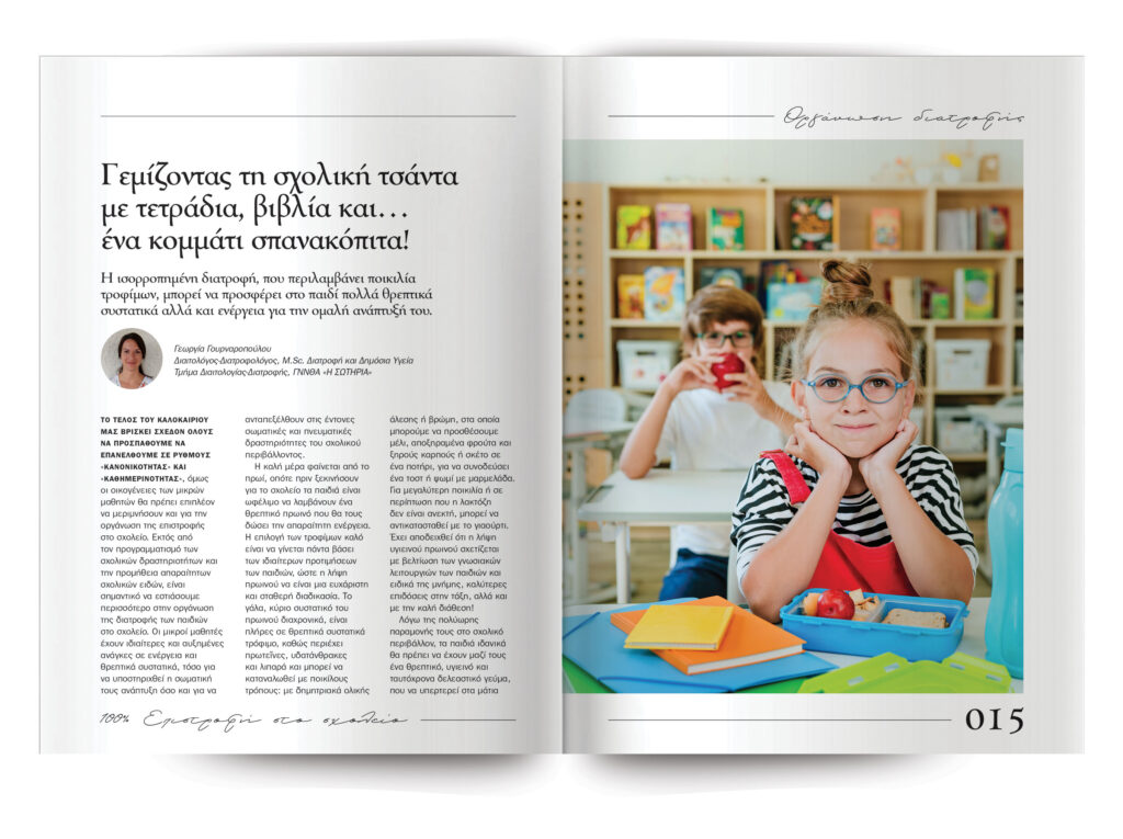 Για τα πιτσιρίκια μας κάθε Σεπτέμβριο ξεκινά μια νέα σχολική χρονιά, γεμάτη υποσχέσεις για υποχρεώσεις. Με απαιτητικά προγράμματα και αυξημένες απαιτήσεις σε ενέργεια και νοητικές λειτουργίες. Για να αντεπεξέρχονται στις προκλήσεις που συναντούν καθημερινά, τα βασικά τους όπλα είναι δύο. Η σωστή διατροφή και η αγάπη από την οικογένειά τους. Για το πρώτο, αποφασίσαμε αυτόν τον μήνα να μοιραστούμε μαζί σας ιδέες, συμβουλές και συνταγές που θα κάνουν λίγο πιο εύκολη την καθημερινότητά σας και την προετοιμασία των σωστών γευμάτων για τα μικρά και μεγαλύτερα παιδιά.