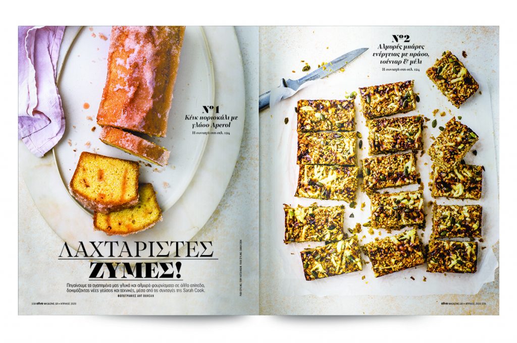 Κέικ πορτοκάλι µε γλάσο Aperol, Αλµυρές µπάρες ενέργειας µε πράσο, τσένταρ & µέλι, Κέικ µε χουρµάδες & αλµυρή σος µελιού, Κούκις µε λευκή σοκολάτα, ταχίνι & πρέτσελ, Ψωµί-µάφιν µε µύρτιλα.
