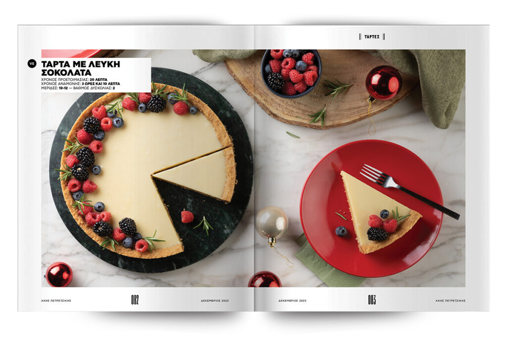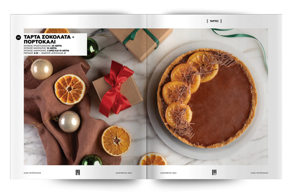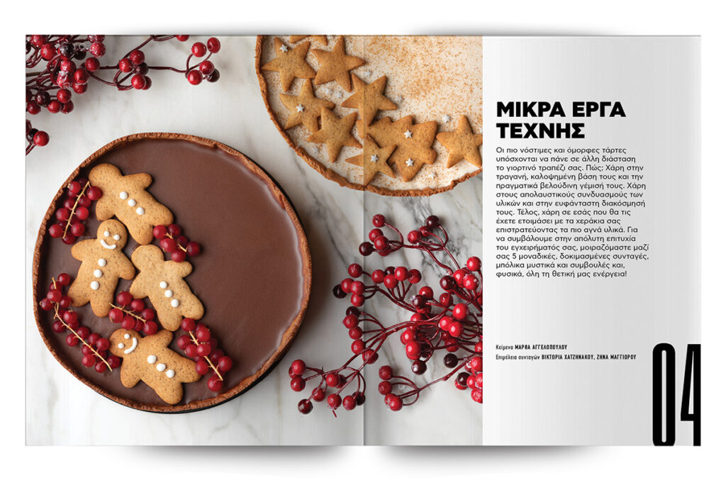 Τέλος, συνθέτουμε πέντε μικρά έργα τέχνης… Με λίγα λόγια, μοναδικές, γιορτινές τάρτες, οι οποίες θα κάνουν τις κάμερες των κινητών σας να πάρουν φωτιά και τα social media σας να παραμιλάνε… Τάρτα με λευκή σοκολάτα, τάρτα gingerbread και τάρτα σοκολάτα-πορτοκάλι. Αυτές είναι τρεις, ενώ εμείς μιλήσαμε για πέντε. Τις άλλες δύο θα τις ανακαλύψετε στις σελίδες που ακολουθούν.