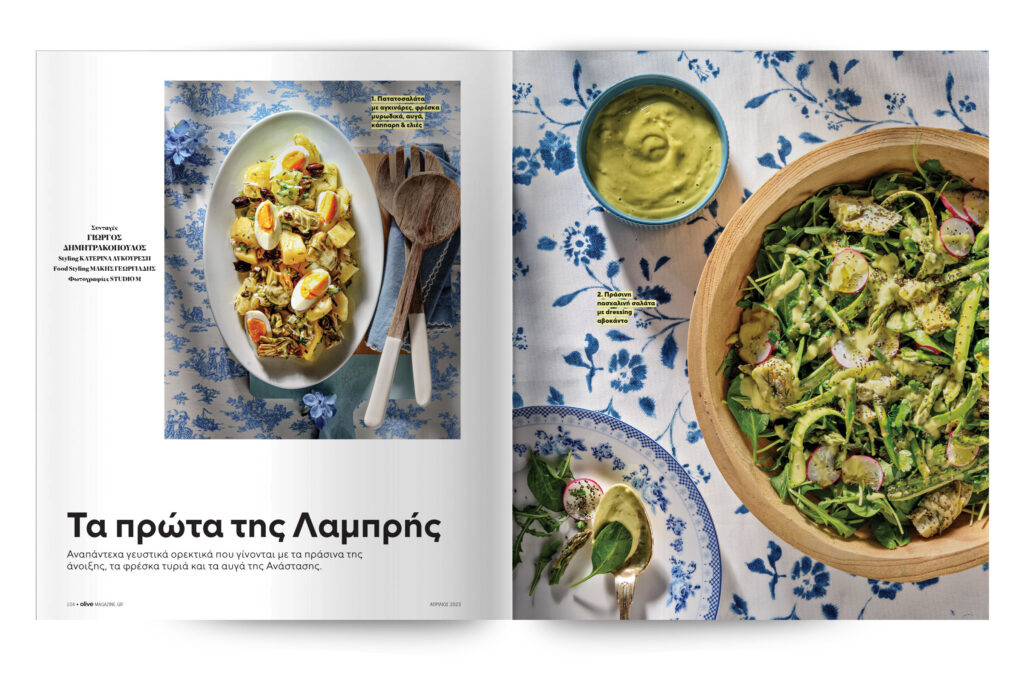 Πατατοσαλάτα με αγκινάρες, φρέσκα μυρωδικά, αυγά, κάππαρη & ελιές, Πράσινη πασχαλινή σαλάτα με dressing αβοκάντο, Αλμυρή πουτίγκα με χριστόψωμο & τυριά που περίσσεψαν, Καραμελωμένα ντοματίνια με αρακά & κρεμμυδάκια εσαλότ, Τάρτα μαγειρίτσας με γραβιέρα Νάξου