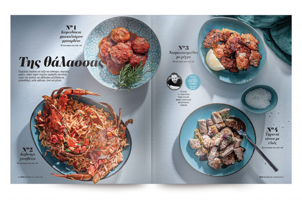 Κεφτεδάκια µπακαλιάρου µπουρδέτο, Καβούρι γιουβέτσι, Ντοµατοκεφτέδες µε ρέγγα, Τηγανιά τόνου µε ελιές