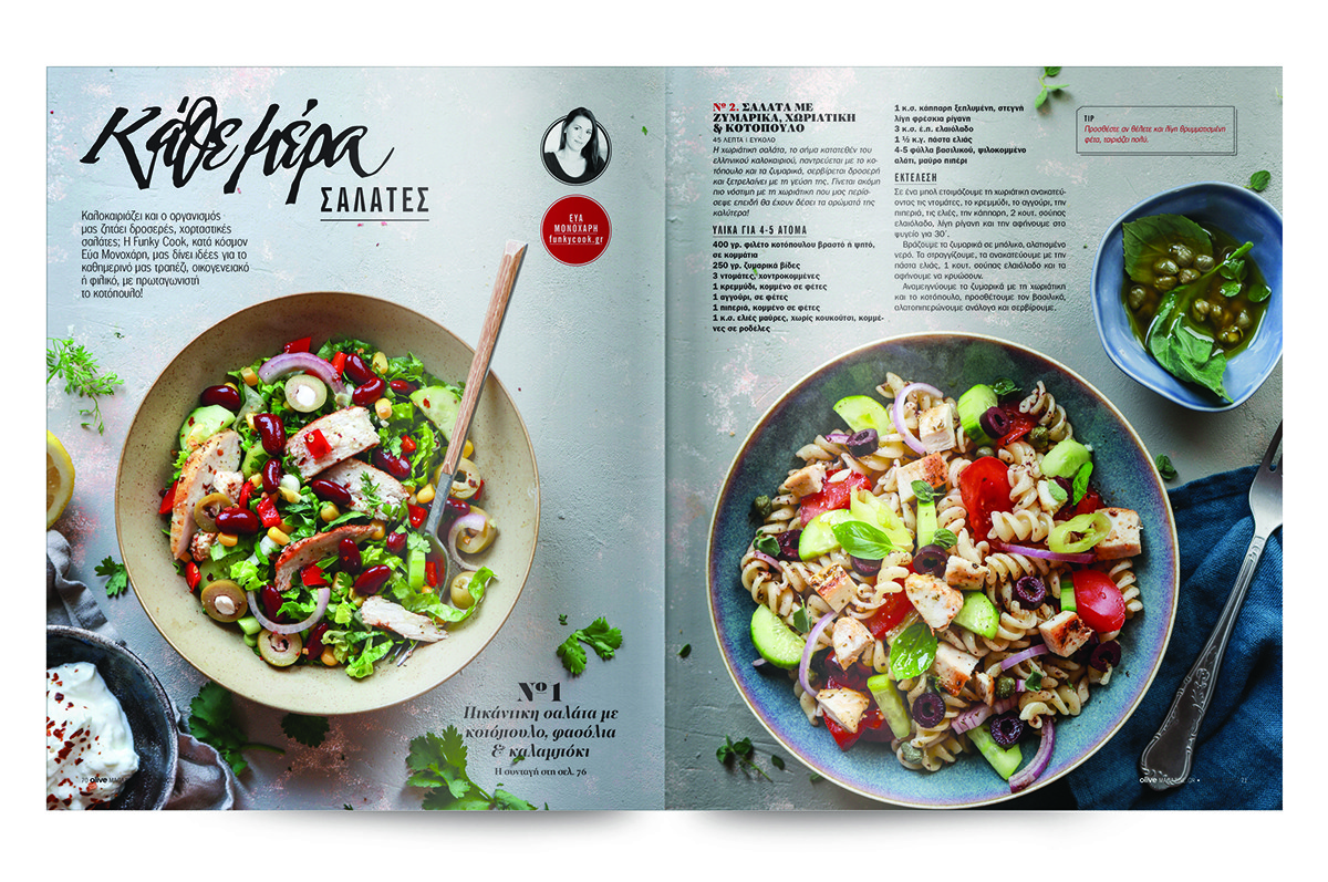 Πικάντικη σαλάτα µε κοτόπουλο, φασόλια & καλαµπόκι, Σαλάτα µε ζυµαρικά, χωριάτικη & κοτόπουλο, Σαλάτα µε φακές, λιαστή ντοµάτα & κοτόπουλο, Σαλάτα φατούς µε κοτόπουλο, Κοτοσαλάτα µε ψητή µελιτζάνα, ντοµατίνια & ξινοµυζήθρα, Σαλάτα µε κοτόπουλο, αβοκάντο, ντοµατίνια & φέτα, Σαλάτα µε κοτόπουλο, ρύζι, σταφίδες & µυρωδικά.