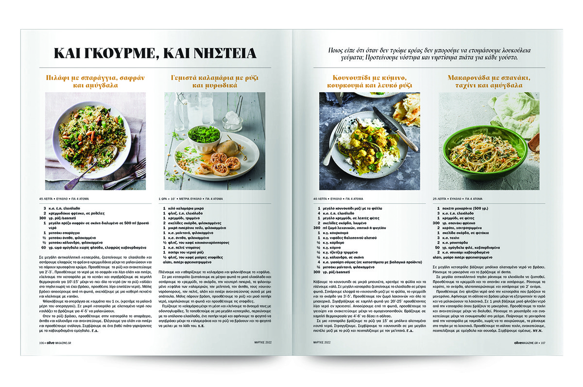 Πιλάφι με σπαράγγια, σαφράν και αμύγδαλα, Γεμιστά καλαμάρια με ρύζι και μυρωδικά, Κουνουπίδι με κύμινο, κουρκουμά και λευκό ρύζι, Μακαρονάδα με σπανάκι, ταχίνι και αμύγδαλα, Χόρτα της λαϊκής μελωμένα στον φούρνο, Βίδες με ταραμά και λεμόνι, Ρεβιθοσαλάτα με ψητά κολοκυθάκια, Γαρίδες τας κεμπάπ