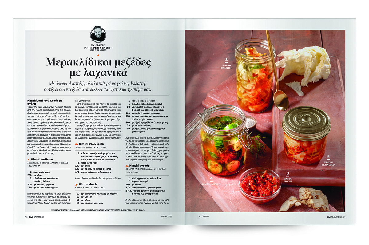 Kimchi πολίτικη, Kimchi σελινόριζα, Πάστα kimchi, Kimchi αγγούρι, Λάχανο με κόλιανδρο, σόγια σος και σουσάμι, Μελιτζάνες σέρτικες, Σκορδαλιά από ψητό κουνουπίδι.