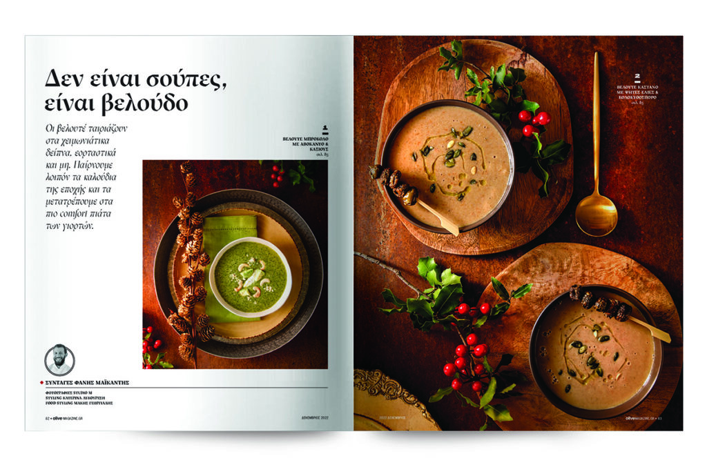 Βελουτέ μπρόκολο με αβοκάντο & κάσιους, Βελουτέ κάστανο με ψητές ελιές & κολοκυθόσπορο, Βελουτέ φακής με καπνιστή πέστροφα & μπούκοβο, Βελουτέ από ψητά κρεμμύδια, ξιδάτο λουκάνικο & σουσάμι, Βελουτέ τραχανά – πράσο, με φτερούγες κοτόπουλου & σπετσερικό Κέρκυρας.