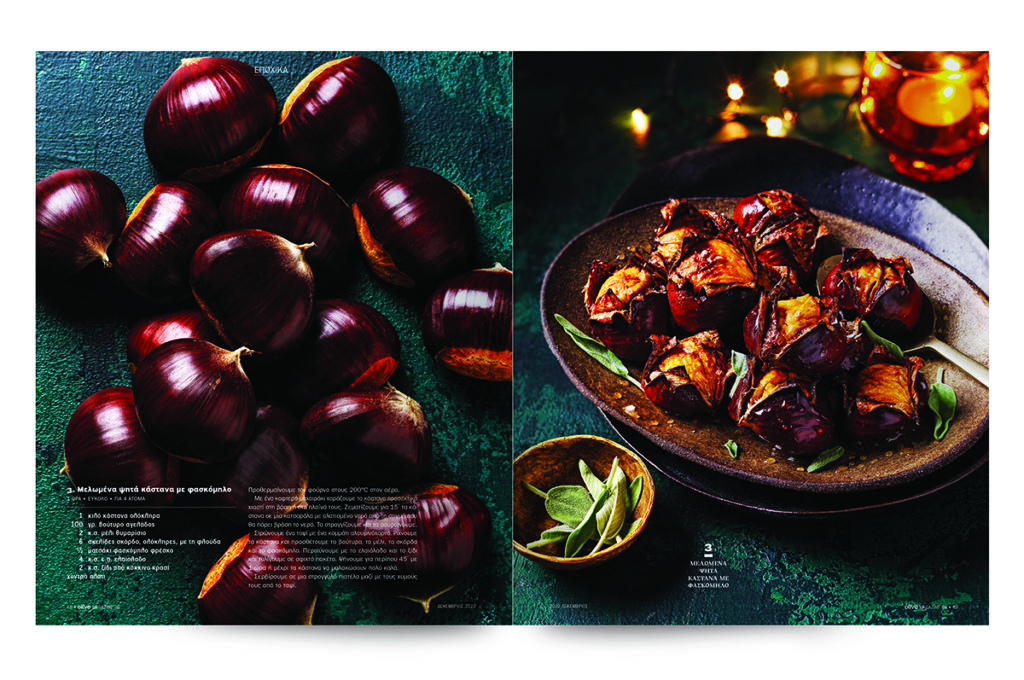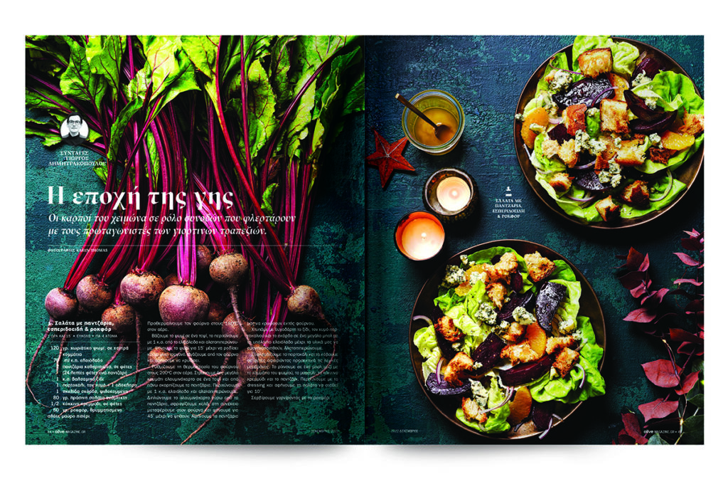 Σαλάτα με παντζάρια, εσπεριδοειδή & ροκφόρ, Ψητές ρίζες με σάλτσα σόγιας & λάιμ, Μελωμένα ψητά κάστανα με φασκόμηλο, Γιορτινό πιλάφι με καρότο, φιστίκι & ρόδι.