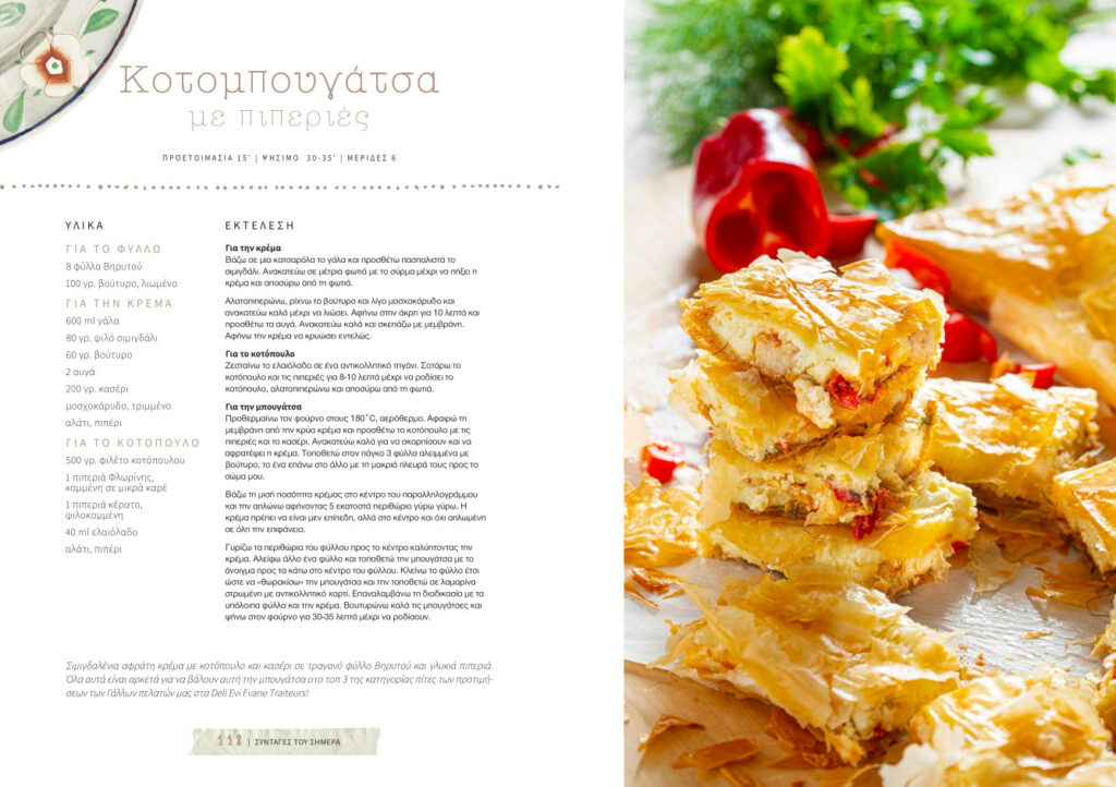 Όπως αναφέραμε παραπνω, κάθε πιάτο έχει τη δική του ιστορία, αλλά όλες οι συνταγές -αλμυρές και γλυκές- έχουν ένα κοινό συστατικό: ένα αρχέγονο υλικό, το αλεύρι. Έτσι, στις σελίδες του βιβλίου αυτού θα βρούμε συνταγές που χωρίζονται σε τρεις μεγάλες κατηγορίες: αρχικά είναι εκείνες του χθες, με αλμυρές προτάσεις όπως παραδοσιακή σπανακόπιτα, τυροπιτάκια με φύλλο κρούστας και ψωμί με προζύμι, αλλά και γλυκές όπως ο μπακλαβάς με ελαιόλαδο και κανταΐφι το κλασικό. Ακολουθούν οι συνταγές από τη γαλλική παράδοση, το «δικό της Παρίσι» -όπως ονομάζει την κατηγορία- και περιλαμβάνει από Quiche Lorraine, Paris Brest, Eclair au chocolat και Profiteroles με κρέμα βανίλιας, μέχρι τάρτα Νορμανδίας με αχλάδια, Madeleines με άρωμα λεμονιού, αλλά και Macarons de Paris. Τέλος, η τελευταία της κατηγορία συνταγών της περιλαμβάνει προτάσεις από το σήμερα, όπως Red Velvet cake, κοτομπουγάτσα με πιπεριές και banana bread με σοκολάτα, μηλόπιτα με σάλτσα καραμέλας, αλλά και παστουρμαδόπιτα με φρέσκες και λιαστές ντομάτες ή κέικ γεμιστό με μπανάνες και σαντιγί.