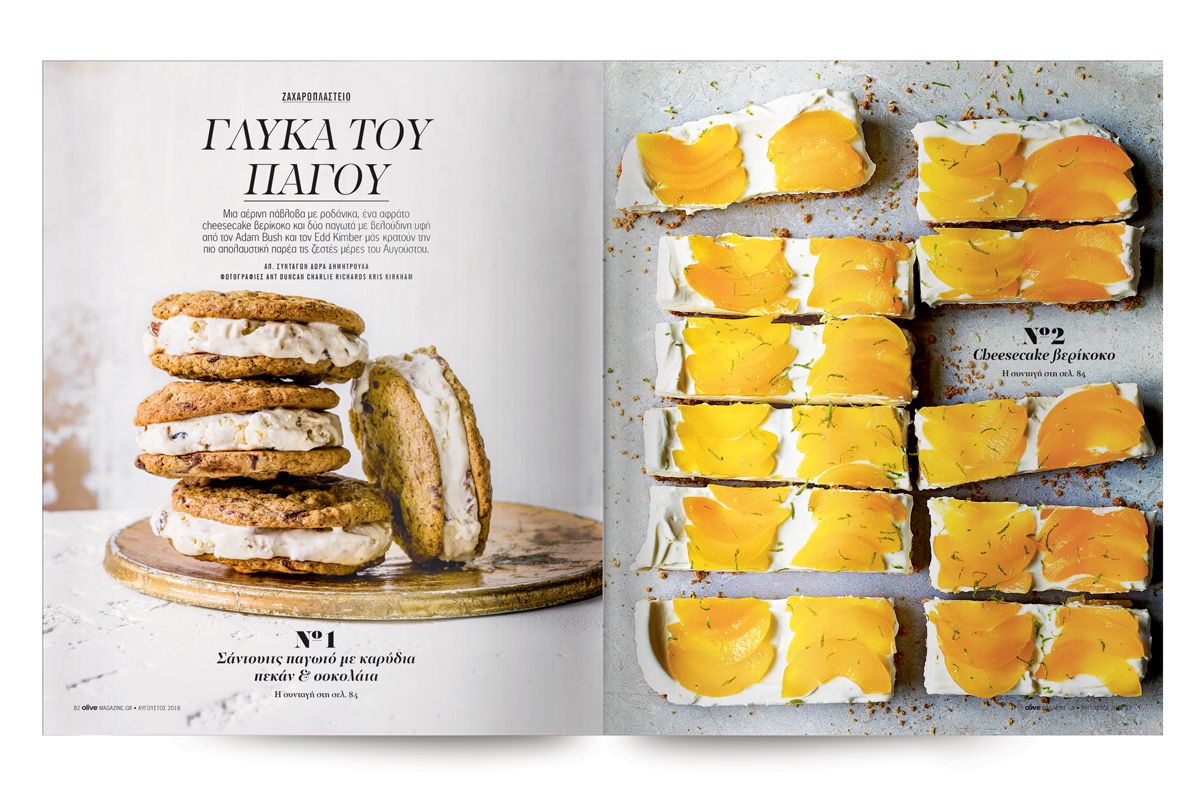Επιδόρπια δροσερά και βελούδινα, ιδανικά για τις ζεστές μέρες του Αυγούστου. Παγωτό σάντουιτς με καρύδια και σοκολάτα, cheesecake με βερίκοκα, πάβλοβα με ψητά ροδάκινα και κρέμα μασκαρπόνε, παγωτό σοκολάτα σε χωνάκι.