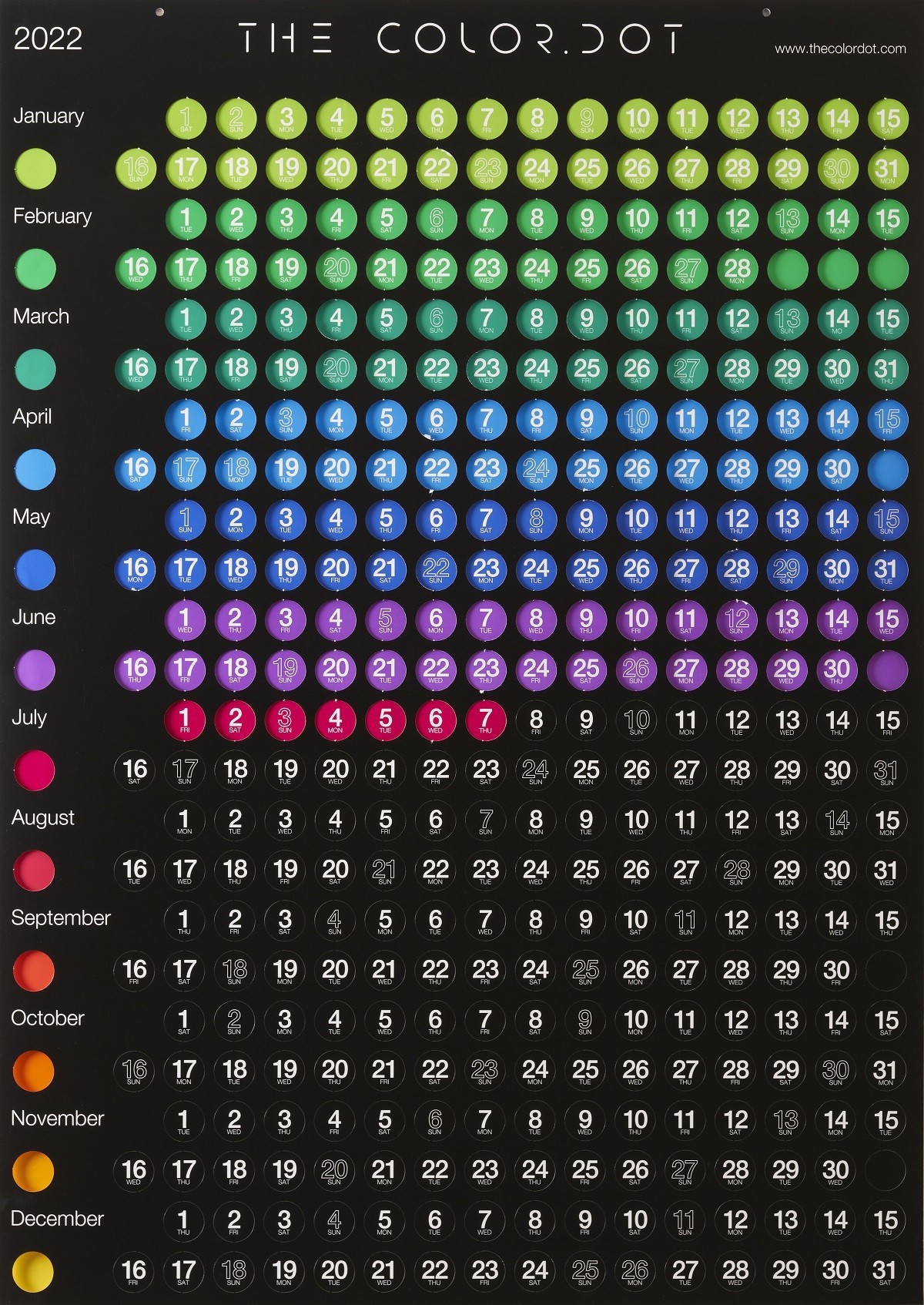 Το The Color Dot συνδυάζει το πρακτικό μέρος με την τέχνη, μιας και είναι το πιο «προχωρημένο» σχεδιαστικά ημερολόγιο που μπορείτε να βρείτε. Στην αρχή βλέπετε ένα σούπερ μοντέρνο μαύρο εξώφυλλο. Καθώς όμως «ανοίγετε» την κάθε μέρα διαπιστώνετε ότι το Color Dot δίνει άλλο χρώμα στον χρόνο σας. Πίσω από την πρώτη του σελίδα, κρύβονται 12 μήνες, κάθε μήνας με ξεχωριστό χρώμα, κάθε μέρα με ένα ξεχωριστό Dot κοπτικό για να σημειώσετε στο πίσω μέρος σημαντικές στιγμές που σας αφορούν. Όσο προχωράει η χρονιά, όλο και περισσότερο χρώμα έρχεται να προστεθεί στον τοίχο σας.