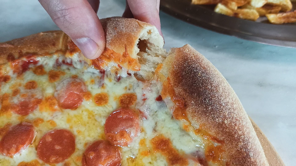 Την σκεπάζουμε με μεμβράνη και την αφήνουμε να ξεκουραστεί για 30 λεπτά. Στη συνέχεια την ξανασχηματίζουμε σε μπάλα και την αφήνουμε για άλλα 30 λεπτά. Ο λόγος που το κάνουμε αυτό είναι για να εγκλωβίσει η ζύμη περισσότερο αέρα και γίνει ακόμα πιο αφράτη. Έπειτα την κόβουμε και σχηματίζουμε 2 μπάλες των 400γρ.Αφήνουμε τις μπάλες μας σε θερμοκρασία δωματίου για 1με 2 ώρες και έπειτα τις τοποθετούμε στο ψυγείο για 24 με 48 ώρες.