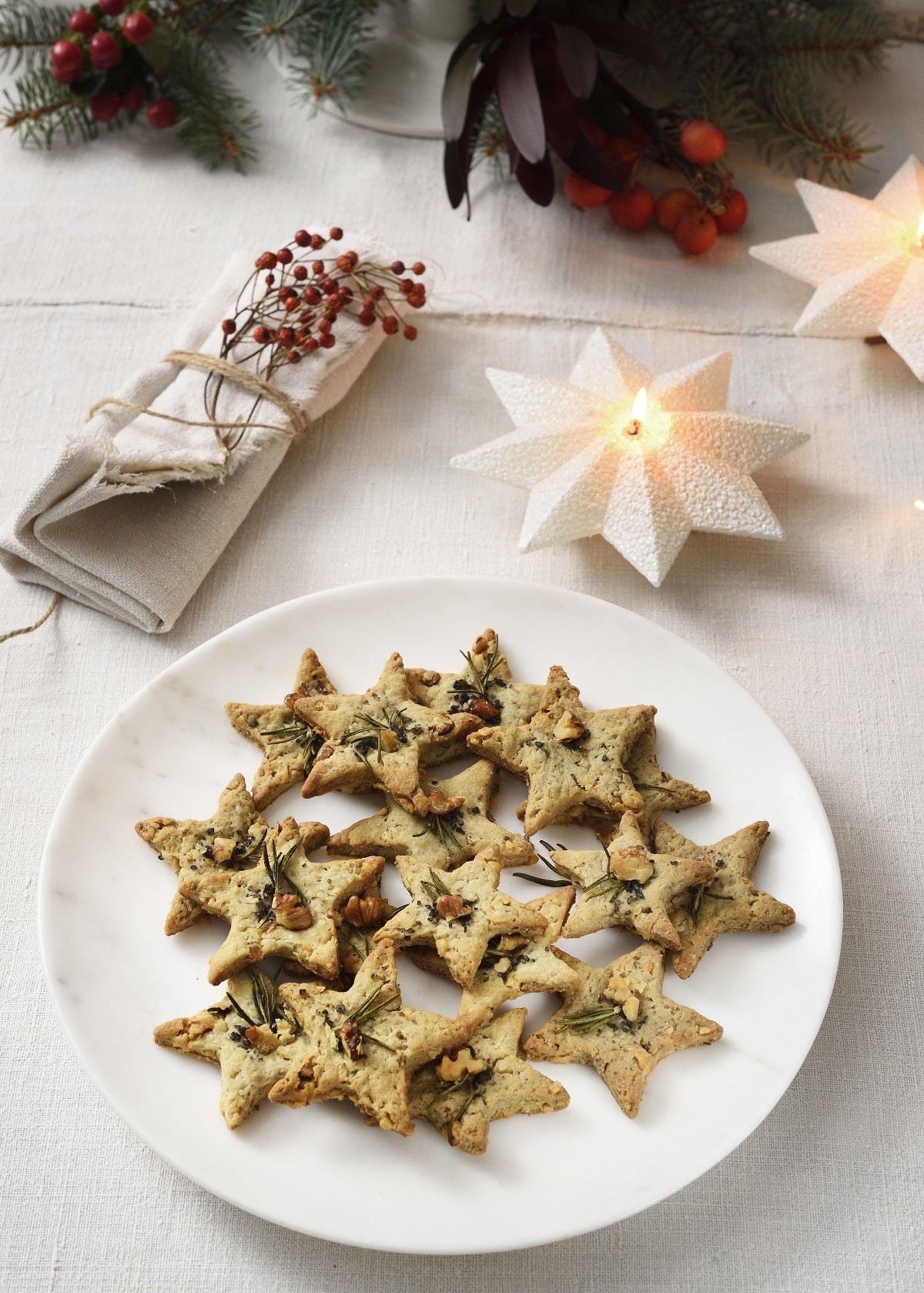 Σε ένα μπολ χτυπάμε το βούτυρο με τους κρόκους. Προσθέτουμε το αλεύρι και σταδιακά κουτάλι-κουτάλι το νερό, όσο χρειαστεί, ώστε να δημιουργήσουμε μια ζύμη εύπλαστη. Καθώς τη ζυμώνουμε προσθέτουμε και το τυρί μαζί με τα καρύδια. Τυλίγουμε τη ζύμη σε μια μεμβράνη και την αφήνουμε στο ψυγείο για 30 λεπτά. Προθερμαίνουμε τον φούρνο στους 180οC στον αέρα. Aπλώνουμε ένα φύλλο λαδόκολλας πάνω σε μια λαμαρίνα ή ρηχό ταψί. Ανοίγουμε τη ζύμη μας πάνω σε ελαφρώς αλευρωμένη επιφάνεια και δημιουργούμε κουλουράκια σε σχήμα αστεριού. Τα αραδιάζουμε στο ταψί. Στο κάθε κουλουράκι επάνω πιέζουμε ένα μικρό κλωναράκι από δεντρολίβανο, λίγο χοντρό αλάτι και ένα κομμάτι καρύδι. Ψήνουμε για περίπου 30-40 λεπτά μέχρι να ροδίσουν.