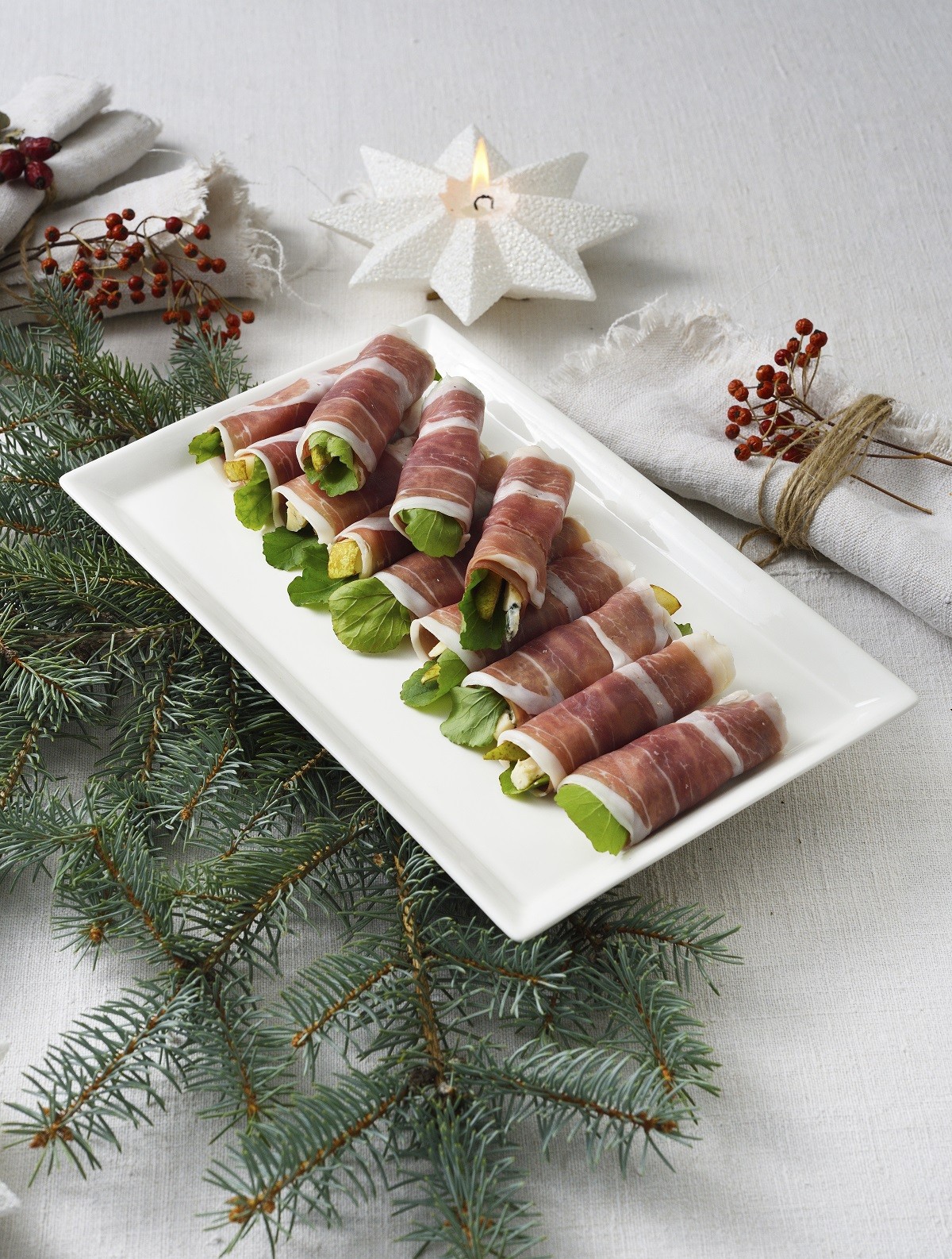 Μικρά ρολάκια με προσούτο, γκοργκοντζόλα και αχλάδι