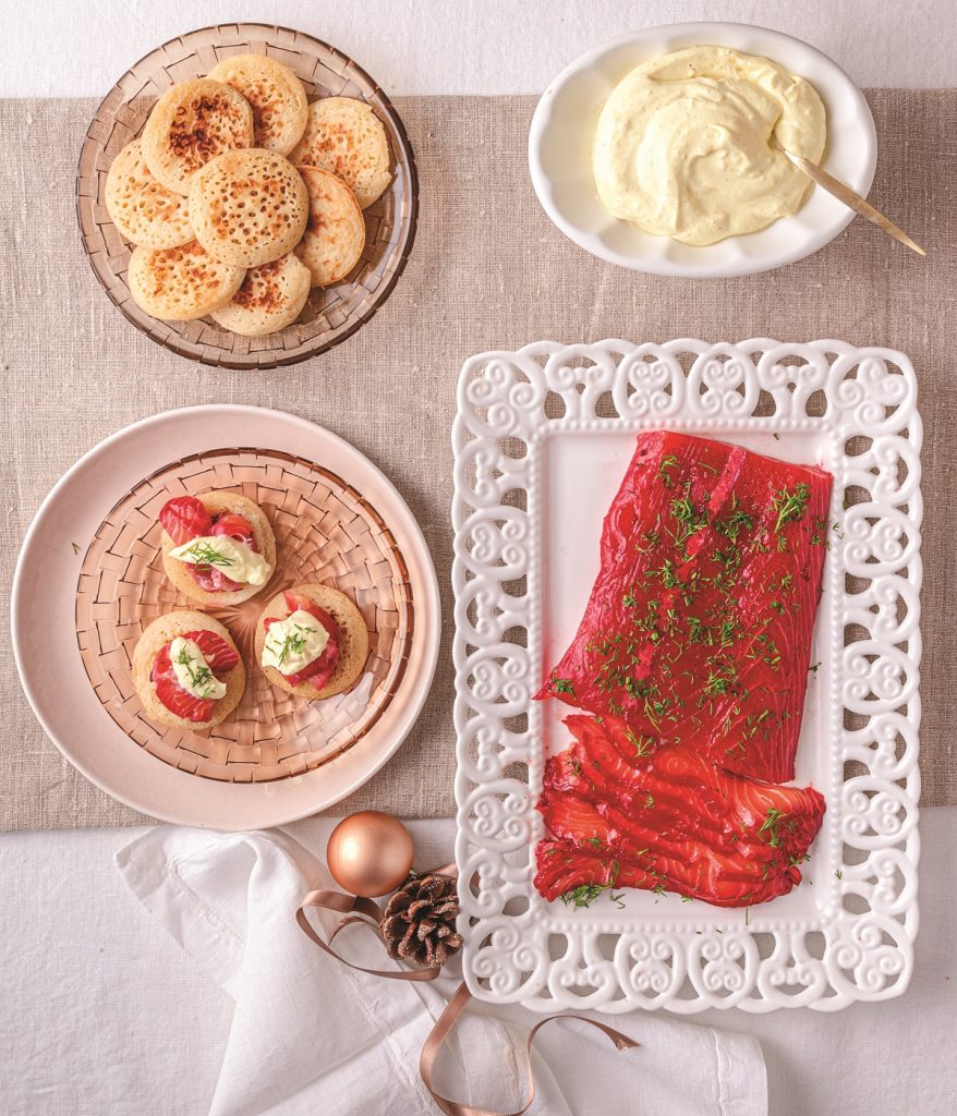 Σολομός Gravlax με παντζάρι , σπιτικά μπλινί και κρέμα με κάρι