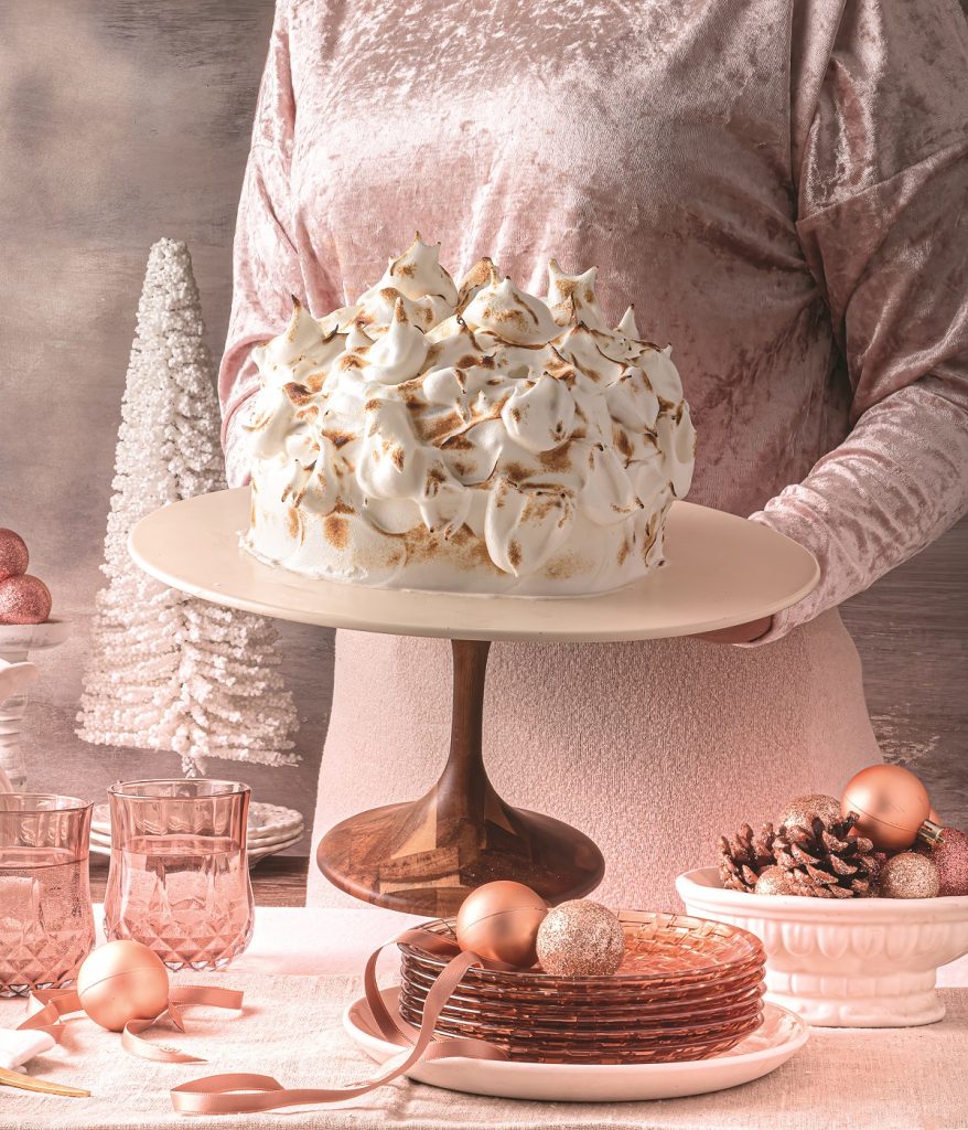 Μαρέγκα: Σε μια κατσαρόλα φτιάχνουμε ένα σιρόπι φέρνοντας τα 280 γρ. ζάχαρη και 85ml νερό στους 126°C. Στο μίξερ χτυπάμε τα ασπράδια μέχρι να γίνουν μαρέγκα και ρίχνουμε το ζεστό σιρόπι με ροή, ενώ ανακατεύουμε. Χτυπάμε για 10΄. Βγάζουμε το κέικ από την κατάψυξη, σκεπάζουμε το πάνω μέρος και τις άκρες με μαρέγκα σε πάχος περίπου 2 εκ. με σακούλα ζαχαροπλαστικής. Ξαναβάζουμε τα πάντα στην κατάψυξη για 1 ώρα. Με φλόγιστρο καίμε τη μαρέγκα, να πάρει χρυσοκίτρινο χρώμα. Σε μικρή κατσαρόλα ζεσταίνουμε το υπόλοιπο Αρμανιάκ.