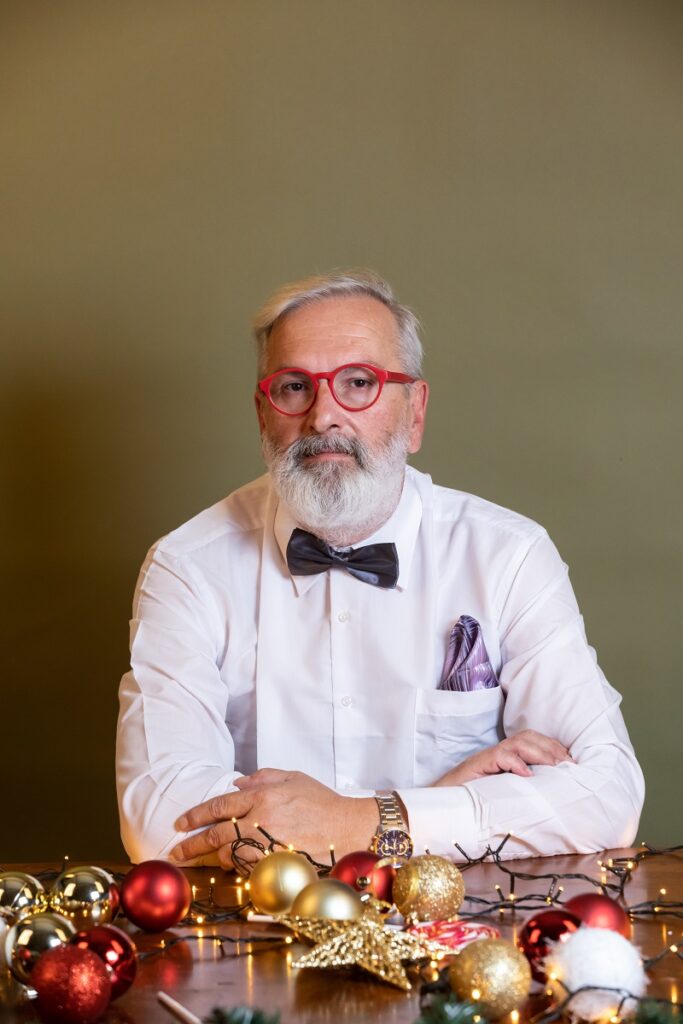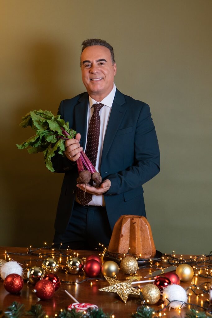 Είναι μια συνήθεια χρόνων για τον Φώτη να οργανώνει το μεσημεριανό γεύμα των Χριστουγέννων στο σπίτι του. «Καλώ την οικογένειά μου και μερικούς πολύ στενούς φίλους. Πρόσωπα αγαπημένα», μου λέει. Όλο το στήσιμο το αναλαμβάνει εκείνος. Δουλειά δύσκολη, χρονοβόρα –ξεκινά δύο μέρες πριν– αλλά ευχάριστη· «ήταν ένα χούι του πατέρα μου αυτό το τραπέζι και εγώ το συνεχίζω», όπως μου αναφέρει. Το μενού είναι σχεδόν πάντα το ίδιο: «Φτιάχνω πάπια γεμιστή με τραχανά, χοιρινό κότσι, πατέ που το ετοιμάζω μόνος μου, και δεν λείπουν φυσικά οι σαλάτες και τα τυριά, πολλά τυριά». Δεν ξοδεύει μια περιουσία για αυτό το γεύμα μιας και, όπως λέει, «δεν ανοίγουμε σαμπάνιες, ούτε τρώμε χαβιάρι. Όλα είναι μέσα στο προϋπολογισμένο μπάτζετ. Τις γιορτές πάντα θα κάνεις κάτι παραπάνω: θα πάρεις ένα καλό ρούχο, ένα δώρο πιο ακριβό. Έτσι γίνεται και για το εορταστικό τραπέζι. Θα ξοδέψεις το κατιτίς». Βέβαια, πιστεύει ότι γιορτές μπορεί να κάνει κανείς ακόμα και με μια μακαρονάδα ή ένα κριθαράκι στον φούρνο. «Σημασία έχει να είσαι με τους ανθρώπους που αγαπάς. Αν έχεις αυτό, μετά το τι θα φας το κάνεις εσύ εορταστικό», μου λέει χαρακτηριστικά. Επιστρέφω την κουβέντα στη μαγειρική που τόσο αγαπά. Τον ξεκουράζει, όπως λέει, και αναζητά χρόνο για να το κάνει. Τον ρωτάω αν ετοιμάζει και τα γλυκά για το τραπέζι. «Η μαμά έφτιαχνε ένα φανταστικό μπακλαβά με φιστίκι Αιγίνης, όμως πλέον δεν μπορεί και δυστυχώς δεν έχω μάθει να το κάνω. Για αυτό, καλού κακού παίρνουμε από κάποιο ζαχαροπλαστείο και ευτυχώς υπάρχουν πολλά καλά στην πόλη», αναφέρει χαμογελώντας. Όσο για τα κρασιά, τα αναλαμβάνουν άλλοι. «Μου φέρνουν πάντα ένα ωραίο κόκκινο κρασί, που μου αρέσει». Πριν κλείσουμε τον ρωτάω γιατί στη φωτογράφηση ήθελε να κρατά παντζάρια. «Δεν βρίσκεις ότι είναι ωραία ανθοδέσμη;» μου απαντά με χιούμορ.