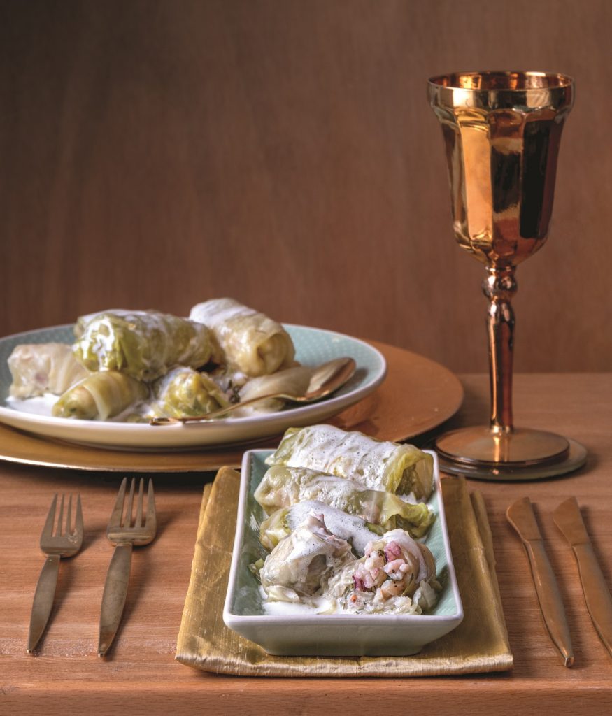 Λαχανοντολμάδες με κιμά γαρίδας και καλαμάρι, αυγολέμονο