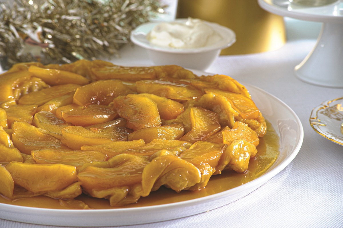 Ρίχνουμε τη ζάχαρη σταδιακά σε τηγάνι 22 εκ. (που μπαίνει στον φούρνο) σε μέτρια προς δυνατή φωτιά και αφήνουμε να λιώσει και να γίνει καραμέλα. Κάθε φορά που λιώνει η ζάχαρη που ρίχνουμε, προσθέτουμε την επόμενη δόση. Όταν λιώσει όλη η ζάχαρη, αποσύρουμε από τη φωτιά και αμέσως ρίχνουμε μέσα τα κρύα κομμάτια βούτυρο. Αραδιάζουμε τα καθαρισμένα μήλα με τη στρογγυλή τους πλευρά να ακουμπάει στο τηγάνι. Τα μήλα τα βάζουμε σε σειρά, σε διάταξη κύκλου το ένα πολύ κοντά στο άλλο, δηλαδή αποφεύγουμε να υπάρχει κενό μεταξύ τους.