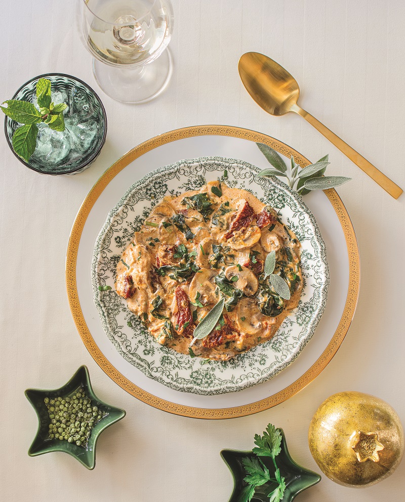 1. Μανιτάρια με κρασί, λιαστή ντομάτα & σπανάκι, σε κρεμώδη σάλτσα