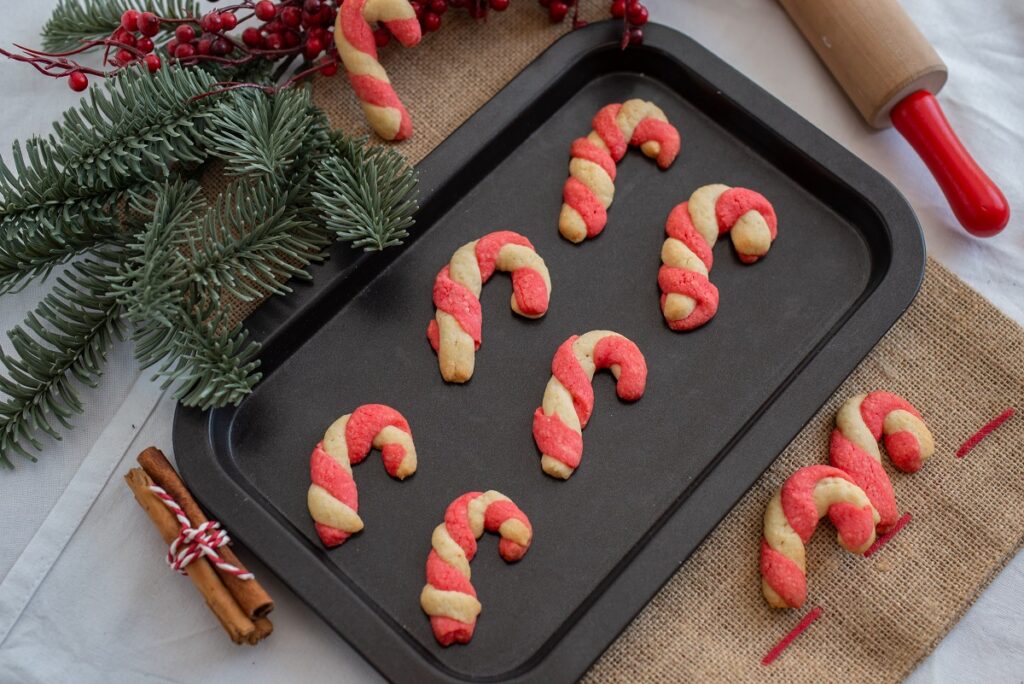 Στρώνουμε αντικολλητικό χαρτί σε δύο ταψιά. Χωρίζουμε κάθε στρογγυλό δίσκο ζύμης σε 24 κομμάτια. Ανοίγουμε το κάθε κομμάτι σε ένα μακρύ κορδόνι. Παίρνουμε ένα κόκκινο και ένα άσπρο κορδόνι και τα στρίβουμε, ώστε να δημιουργηθεί ένα μπαστουνάκι. Τα τοποθετούμε στα ταψιά και τα βάζουμε στο ψυγείο να παγώσουν για τουλάχιστον 30 λεπτά.