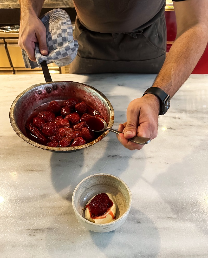 Στο ίδιο υψηλό επίπεδο με τα πιάτα στάθηκαν και τα γλυκά. Μέσα σε ένα μαντέμι πάνω στα κάρβουνα σιγοψήνονταν, για κάποια ώρα, φράουλες, «με λίγο χυμό από κάτι τελευταία σαγκουίνι που βρήκαμε στη λαϊκή», όπως μου είπε ο Σπύρος. Σε ένα μπολάκι φέρνει παγωτό από βιολογικό γάλα, για την παρασκευή του οποίου χρησιμοποιεί μόνο ακατέργαστη μαύρη ζάχαρη, πάνω του προσθέτει λίγες φράουλες καυτές από το μαντέμι και έτοιμο. Ντελικάτο, λίγο γλυκό, λίγο όξινο, φρέσκο, απλά καταπληκτικό, το τέλειο φινάλε σε ένα γεύμα που θα αναζητήσω σίγουρα πάρα πολύ σύντομα.