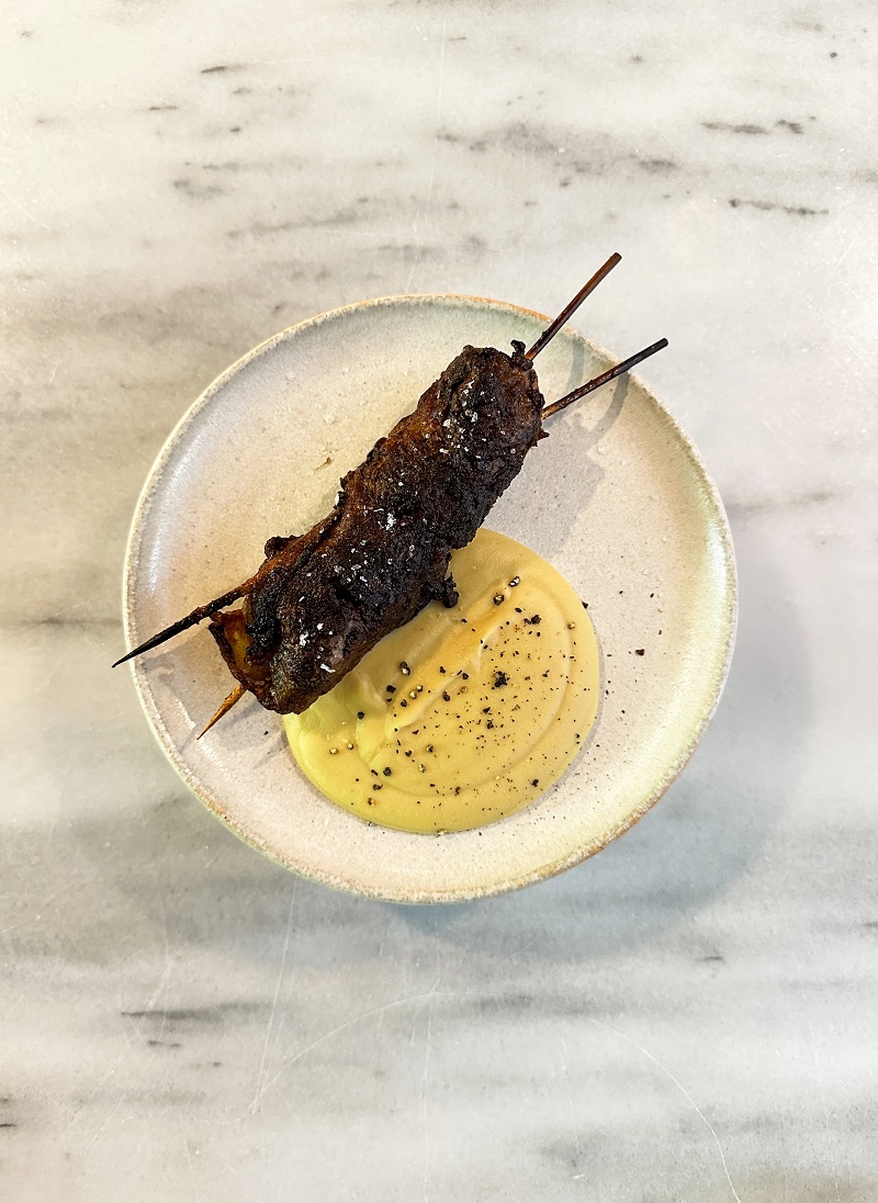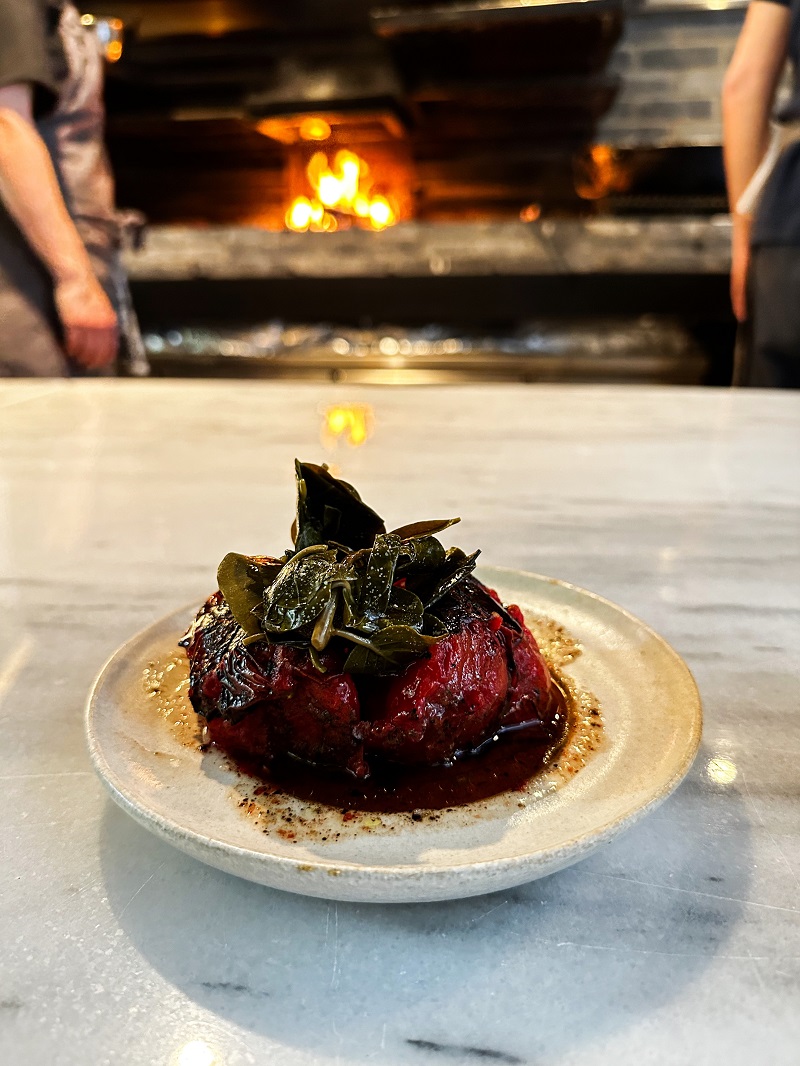 Η ντομάτα που σιγοψήθηκε στη σχάρα, ζουλήθηκε ελαφρά στο πιάτο για να βγάλει τα ζουμιά της και μαζί με ελαιόλαδο και μπόλικα φύλλα κάπαρης, ήταν η τέλεια συνοδεία για το φρεσκοζυμωμένο ψωμάκι που ήρθε στο τραπέζι και μου θύμισε τη γεύση και την αγνότητα από αντίδωρο. Σειρά πήραν και άλλα εξαιρετικά πιάτα όπως το φρικασέ από μανιτάρια κανθαρέλες και αρνίσια γλυκάδια, τα συκωτάκια που τυλίγονται σε μπόλια και σερβίρονται με μια καλά αρτισμένη και φίνα φάβα και το λεπτοκομμένο και αρωματικό ταρτάρ κατσίκας.