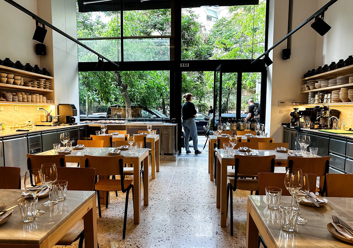 Από τη μία άκρη η κουζίνα με την ανοιχτή φωτιά να κλέβει τις εντυπώσεις και από την άλλη άκρη το section της ζαχαροπλαστικής και το αρτοποιείο, τα οποία πιάνουν δουλειά από νωρίς το πρωί. «Το μαγαζί δεν είναι απλώς ένα εστιατόριο. Από τις 9 το πρωί θα προσφέρουμε 2 ψωμιά, βαριά προζυμένια, το ένα κρίθινο το άλλο καλαμποκιού, από άλευρα που φέρνουμε από μικροπαραγωγούς, μερικά γλυκά, ακόμα και το δικό μας κρουασάν, που δε θα θυμίζει σχεδόν σε τίποτα το κλασικό, θα είναι προζυμένιο, πιο ρουστίκ, κάπως πιο άγριο», επισημαίνει ο Σπύρος.
