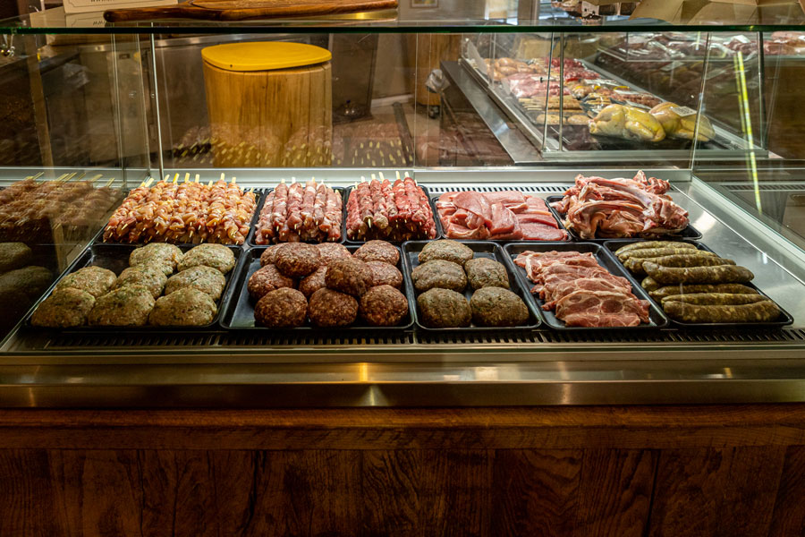 Ο χώρος του κρεοπωλείου της Φάρμας Μπράλου διαμορφώθηκε ειδικά και πλέον φιλοξενεί εκτός από τις βιτρίνες ψυγεία, με εκλεκτά κρέατα και τα κρεατοσκευάσματα και μια μεγάλη ψησταριά με κάρβουνα.
