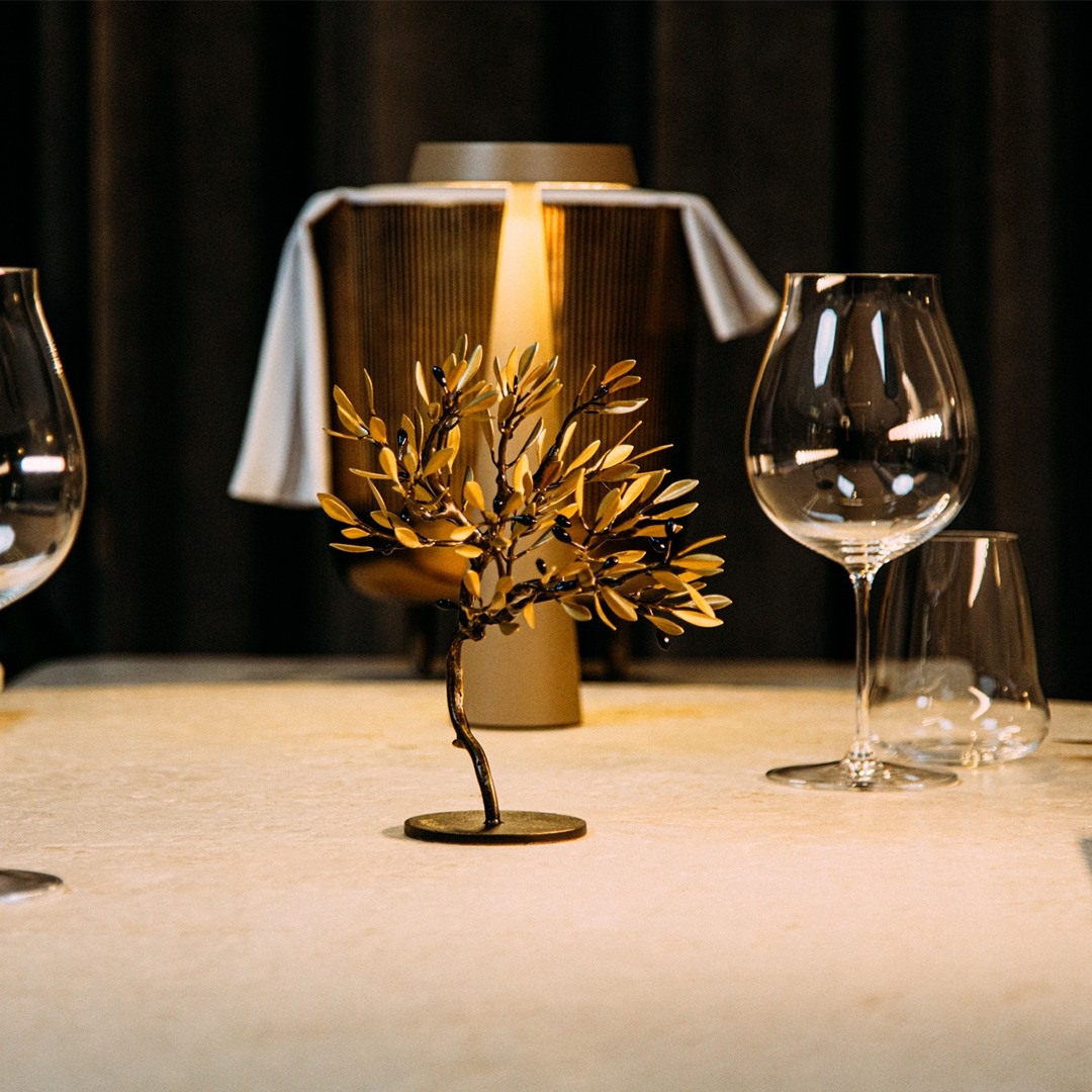 Δυστυχώς, τη μέρα που το επισκέφτηκα, η βροχή δεν μου επέτρεψε να καθίσω στην πολύ όμορφη και ατμοσφαιρική ταράτσα που βλέπει στον Ιερό Βράχο και στο ναό του Ηφαίστου. Βολεύτηκα όμως, στην εξίσου ωραία, λιτή σάλα με τον ζεστό φωτισμό. Τα τραπέζια σε αυτήν είναι λιγοστά -γύρω στα έξι- όμως υπάρχει και άλλη στο υπόγειο με γυάλινο δάπεδο που επιτρέπει να βλέπει κανείς τα αρχαία που βρίσκονται εκεί. Η αλήθεια είναι ότι η συγκεκριμένη σάλα έχει μια πιο μυσταγωγική ατμόσφαιρα, η οποία δίνει μια διαφορετική αίσθηση στη γευστική εμπειρία που προσφέρει το Makris.
