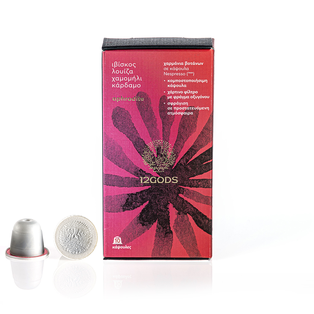 Μια εντελώς διαφορετική προσέγγιση ως προς τον τρόπο χρήσης, έρχεται από την 12 GODS που δημιουργεί χαρμάνια βοτάνων, τυποποιημένα σε πλήρως βιοδιασπώμενη κάψουλα, κατάλληλη για μηχανές καφέ. Σε συνεργασία με το Aroma Hub προχώρησαν σε μεθοδική και εμπεριστατωμένη έρευνα για την αποτύπωση των ισχυρισμών υγείας που αφορούν τα αρωματικά και φαρμακευτικά φυτά που χρησιμοποιούν. Έτσι, δημιούργησαν μια σειρά βοτανικών αφεψημάτων από τσουκνίδα, ευκάλυπτο, θυμάρι, χαμομήλι που μπλέκονται με ιβίσκο, καρδάμωμο, γλυκάνισο και άλλα αρωματικά.