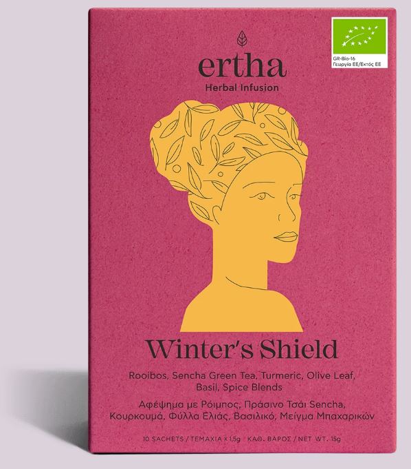 Ειδικά για τις κρύες ημέρες του χειμώνα, η ERTHA προτείνει το Winter Shield, ένα βοτανικό μείγμα με αντιοξειδωτικές και αντιφλεγμονώδεις ιδιότητες που ενισχύει το ανοσοποιητικό σύστημα. Περιέχει: ρόιμπος, πράσινο τσάι Sencha, κουρκουμά, φύλλα ελιάς, ιερό βασιλικό και μείγμα μπαχαρικών. Μάθετε περισσότερα στο: www.ertha.gr.