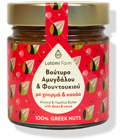 Η Μαρία και ο Ηλίας, δυο γεωπόνοι – γονείς, ζουν μόνιμα στο χωριό Λατόμι κοντά στο Κιλκίς φροντίζοντας τα δέντρα τους. Από τους καρπούς των δέντρων που καλλιεργούν, δημιουργούν ανώτερης ποιότητας βούτυρα, που συνδυάζονται με πρώτες ύλες επιλεγμένες με αυστηρά κριτήρια ως προς την προέλευση, την ηθική και την υψηλή διατροφική αξία. Το βούτυρο «αμυγδάλου και φουντουκιού με χουρμά και κακάο» περιέχει 50% Ελληνικά αμύγδαλα, 41% Ελληνικά φουντούκια, 7% βιολογικό σιρόπι χουρμά (100% χουρμάδες) και 2% βιολογικό κακάο. Μάθετε περισσότερα στο www.latomifarm.gr.