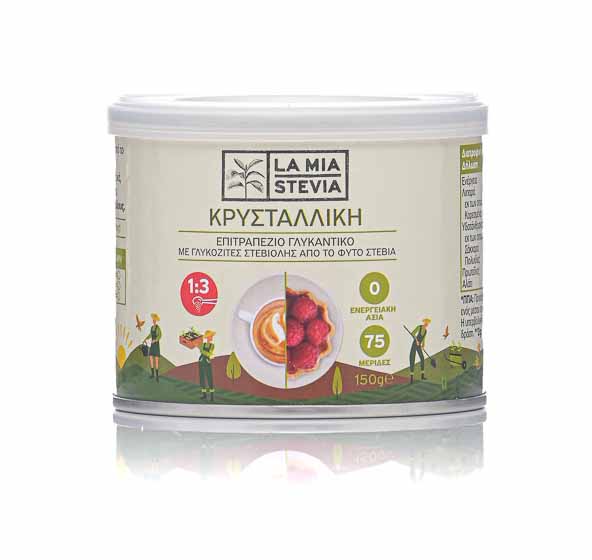 Η στέβια είναι ένα φυτό που δεν περιέχει θερμίδες και δε μεταβάλλει τον γλυκαιμικό δείκτη. Οι γλυκοζίτες στεβιόλης ή αλλιώς η καθαρή στέβια όπως είναι ευρέως γνωστή, είναι έως και 400 φορές πιο γλυκιά από τη ραφιναρισμένη ζάχαρη. Για να παρασκευαστεί ένα σπιτικό κέικ, χρειάζεται μόλις 1 γραμμάριο καθαρής στέβιας. Αντίστοιχα, για έναν καφέ ή ρόφημα χρειάζεται μόνο ένας κόκκος. Αυτό σημαίνει πως δεν μπορεί να χρησιμοποιηθεί για οικιακή χρήση παρά μόνο για επαγγελματική από βιομηχανίες τροφίμων που παράγουν προϊόντα σε μεγάλη κλίμακα. Για ευκολία στην καθημερινή χρήση προστίθεται ένα επιπλέον 100% φυσικό συστατικό που λέγεται ερυθριτόλη. Η ερυθριτόλη με τη σειρά της, είναι ένα φυσικό προϊόν που προκύπτει έπειτα από τον βρασμό καλαμποκιού ή λαχανικών. Δεν έχει θερμίδες, δε μεταβάλλει τον γλυκαιμικό δείκτη και προστίθεται μόνο για να δώσει τον όγκο που απαιτείται. Το επιτραπέζιο γλυκαντικό «La Mia Stevia Κρυσταλλική Στέβια» είναι ιδανική λύση για να αντικαταστήσει πλήρως τη ζάχαρη. 1 κουταλιά ισοδυναμεί σε 3 κουταλιές ζάχαρης. Παράγεται στην Ελλάδα από τον Συνεταιρισμό Stevia Hellas Coop με έδρα τη Λαμία και μπορείτε να την προμηθευτείτε από όλα τα supermarket της χώρας.