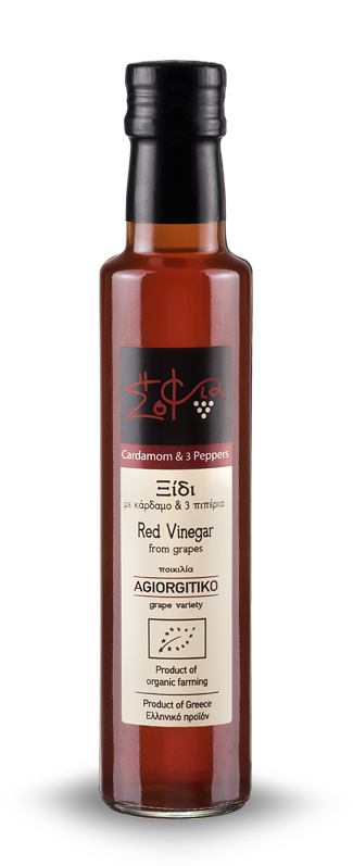 Αυτό το ιδιαίτερα αρωματικό ξίδι προέρχεται από τους αμπελώνες της Νεμέας όπου παράγεται το κρασί ΠΟΠ Νεμέα και δημιουργός είναι η επιχείρηση «Σοφία της Φύσης» που εξειδικεύεται στην παραγωγή βιολογικών ξιδιών και πετιμεζιού. Περιέχει ολόκληρο σπόρο κάρδαμου και μείγμα από πράσινο, κόκκινο και λευκό πιπέρι, τα οποία εμβαπτίζονται μέσα σε κόκκινο βιολογικό ξίδι από Αγιωργίτικο για όσο διάστημα χρειάζεται, προκειμένου να δώσουν ένα πληθωρικό αρωματικό μπουκέτο και τη χαρακτηριστική πικάντικη γεύση. Έχει ρουμπινί διαυγές χρώμα, έντονα αρώματα από κάρδαμο και κόκκινα φρούτα, αρκετά όξινη και πικάντικη γεύση, με επίγευση αποξηραμένων φρούτων και άγριας ρόκας. Πρόκειται για ένα πλούσιο αρωματικό ξίδι που είναι ιδανικό για να μαρινάρει κόκκινο κρέας ή για να αρτύσει λιπαρά καπνιστά ψάρια όπως σολομό και πέστροφα. Η Σοφία της Φύσης, βρίσκεται στον διάσημο αμπελώνα της Νεμέας και έχει επισκέψιμες εγκαταστάσεις που λειτουργούν όλο το χρόνο. Μάθετε περισσότερα στο www.sofiatisfisis.gr.