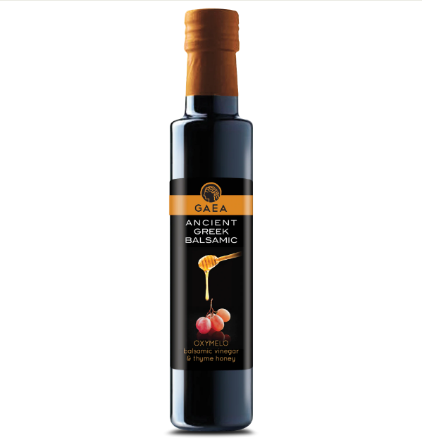 Αυτό το βαλσαμικό ξίδι ονομάζεται Οξύμελο και όπως μαρτυράει η λέξη παρασκευάζεται από την ένωση ξιδιού με μέλι. Πηγή έμπνευσης είναι μια αρχαία συνταγή της Μινωικής περιόδου στην Κρήτη, όπου η διαδικασία παλαίωσης γινόταν σε μεγάλα πιθάρια θαμμένα στη γη. Σήμερα τα πιθάρια έχουν αντικατασταθεί με βαρέλια παλαίωσης και η ζύμωση γίνεται με μια ειδική φυσική τεχνική που επιτρέπει στο βαλσαμικό να πήξει χωρίς προσθήκη ζάχαρης. Το θυμαρίσιο μέλι του δίνει έξτρα γλύκα και καραλεμένια γεύση, έχει βαθύ καστανόξανθο χρώμα και ταιριάζει ιδανικά με κατσικίσιο τυρί ψημένο στη σχάρα, κρεμώδη τυριά ή ως βάση για βινεγκρέτ. Θα το βρείτε σε όλα τα supermarket. Περισσότερες πληροφορίες: www.gaeagreece.com.