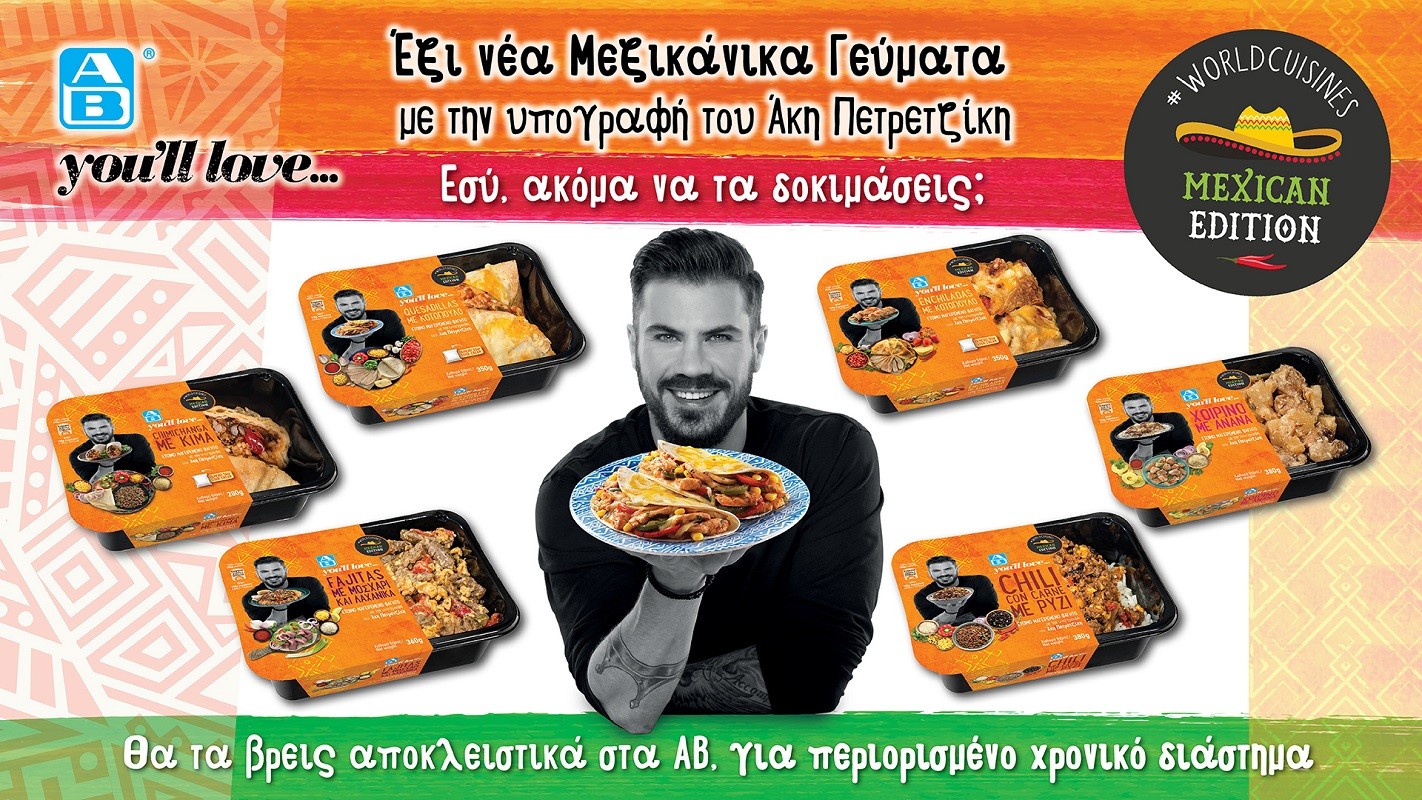 Η Μεξικανική είναι κουζίνα με «θερμό» ταπεραμέντο. Νόστιμη, «χρωματιστή», με εντάσεις. Με πολλούς και φανατικούς φίλους και γι’ αυτό αρέσει ιδιαίτερα. Καθώς τώρα είναι ακόμη πιο δύσκολο να ταξιδεύσουμε στο μακρινό Μεξικό για να την απολαύσουμε, η ΑΒ τη φέρνει κοντά μας, με τα νέα Έτοιμα Γεύματα «AB You’ll love» και την υπογραφή του Άκη Πετρετζίκη.