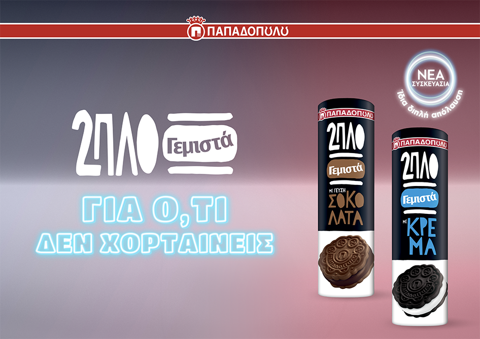 Τα 2πλοΓεμιστά Παπαδοπούλου αλλάζουν συσκευασία αναδεικνύοντας τον νεανικό τους χαρακτήρα και συνεχίζοντας να προσφέρουν την ίδια 2πλη απόλαυση.