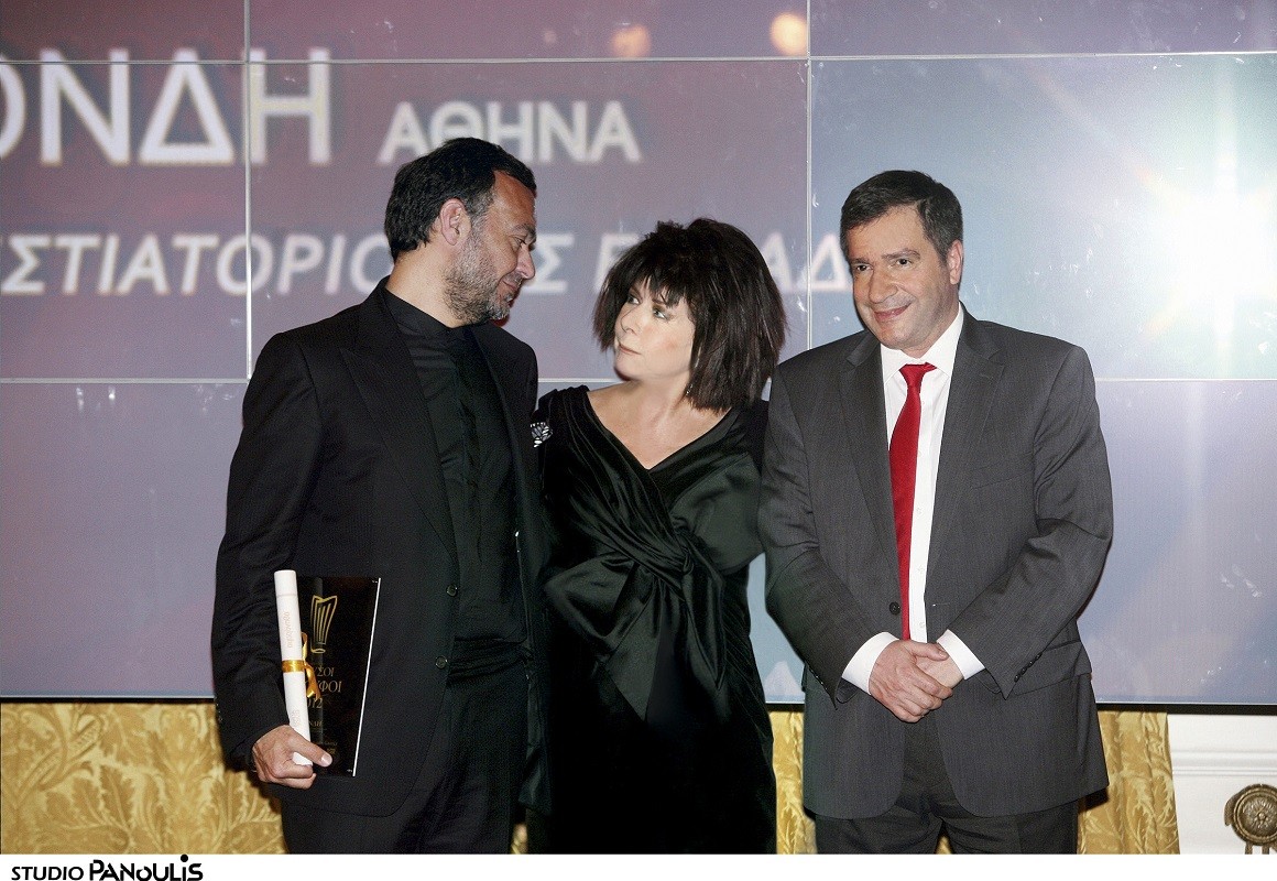 Χρυσοί Σκούφοι 2012: ο Απ. Τραστέλης με την εκδότρια του «Αθηνοράματος» Αννη Ηλιοπούλου και τον Γιώργο Καμίνη.