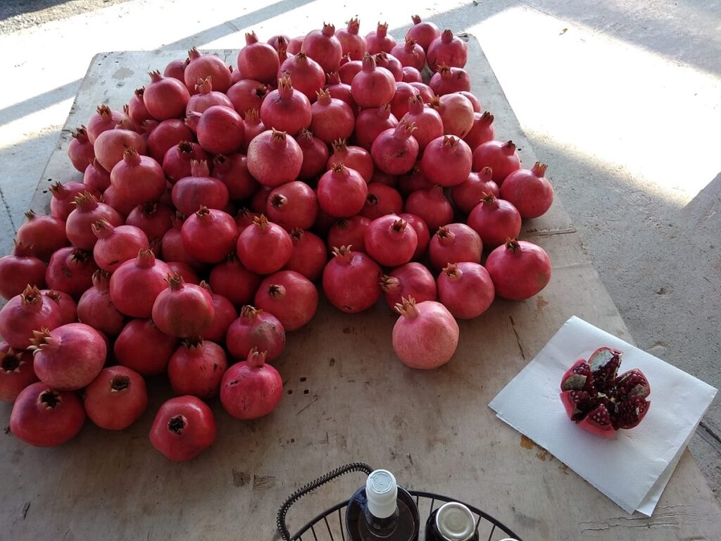 Το μάζεμα των ροδιών, γίνεται αποκλειστικά με το χέρι. «Γι’αυτό και η συγκομιδή απαιτεί πολλά μεροκάματα και εργάτες με εμπειρία και γνώση» μου εξηγεί η Γιώτα. «Τα ρόδια τα αντιμετωπίζουμε κατά τη συλλογή τους, σαν αβγά. Τοποθετούνται ένα-ένα προσεχτικά σε ειδικά τελάρα και φροντίζουμε να μην εφάπτονται μεταξύ τους γιατί όταν χτυπηθούν χαλάνε. Οι κορώνες τους «κοιτούν» πάντα προς τα πάνω για να μην σπάσουν. Επίσης δεν τα κόβουμε με τα κοτσάνια τους γιατί μπορεί να τραυματίσουν το διπλανό τους ρόδι στο τελάρο και έτσι να χαλάσει» μου εξηγεί η Γιώτα.