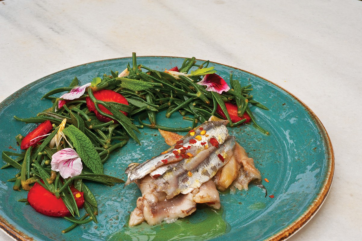 Πασπαλάς με θαλασσινά, σαλιγκάρια με σύγκλινο και φραγκόσυκο, τσιγαριαστά άγρια χόρτα με ξινόγαλο, αυγό φρύδι και τσουχτό γίδινο βούτυρο αρωματισμένο με ξηρό δυόσμο, κακαβιά με γκόγκες και σαρμαδάκια με φύλλα βασιλικού, κρέμα μαστίχας από κατσικίσιο γάλα με γρανίτα τριαντάφυλλο και φιλέ αμυγδάλου και παγωμένα τσάγαλα.