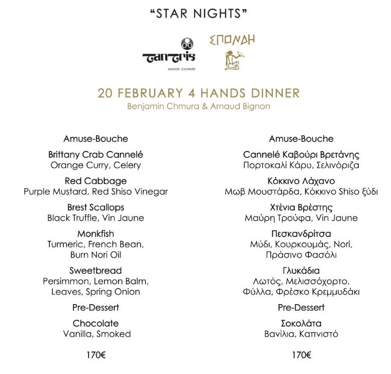 Πρόκειται για ένα μενού 7 σταδίων που ολοκληρώνεται με ένα επιδόρπιο από τον pastry chef της Σπονδής. Πώς το έχτισαν; Με απόλυτη σύμπνοια και συνεργασία. «Όταν κάλεσα τον Benjamin να έρθει να μαγειρέψει μαζί μου, τον ρώτησα τι θέλει να φτιάξει. Για μένα σημαντικό είναι να δούμε και signature πιάτα του εστιατορίου του καλεσμένου μας». Και έτσι κατέληξαν στο μενού που βλέπουμε παρακάτω. Όπως μου ανέφεραν, τα πιάτα είναι λίγο-πολύ χωρισμένα: 3 του Bignon και 3 του Chmura.