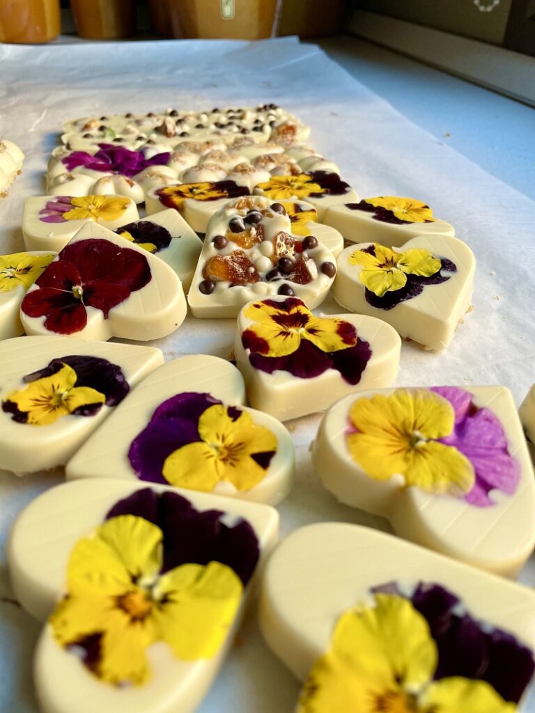 Τα πρώτα σοκολατάκια που έφτιαξε σε συνεργασία με τους The Chilli Factor (και που εξακολουθεί να τα φτιάχνει ως best seller), είχαν γέμιση από τη Fraizy Spice Strawberry sauce της Λίλιαν (με φράουλα και τσίλι). Έπειτα, πήγε τη δουλειά της ένα βήμα παραπέρα και έκλεισε τα λουλούδια τους μέσα στα σοκολατάκια της, δημιουργώντας σοκολατένια κομψοτεχνήματα, αληθινά έργα τέχνης. Αγαπημένο της λουλούδι, οι βιόλες, καθώς όπως μου διευκρινίζει «έχουν μία πιπεράτη γεύση η οποία ταιριάζει πάρα πολύ με τη σοκολάτα». Μάλιστα θυμάται πως, κάποια στιγμή επειδή η Λίλιαν είχε μεγάλη παραγωγή σε βιόλες, τις έκανε μαρμελάδα την οποία η Σάντυ χρησιμοποίησε σε γεμίσεις για τα σοκολατάκια της, με αποτέλεσμα αυτά να έχουν βιόλα μέσα (σε μαρμελάδα) και βιόλα απ’ έξω. Της αρέσει, ωστόσο, να χρησιμοποιεί και άλλα βρώσιμα λουλούδια από τον μπαξέ της Λίλιαν, όπως μαργαρίτες, πανσέδες κλπ (τα βάζει στις σοκολατένιες μπάρες που ακολούθησαν, δηλαδή σε ρολάκια που κλείνουν στο εσωτερικό τους λουλούδια).