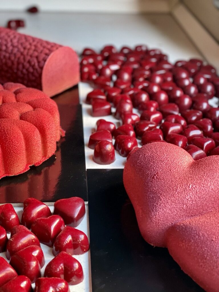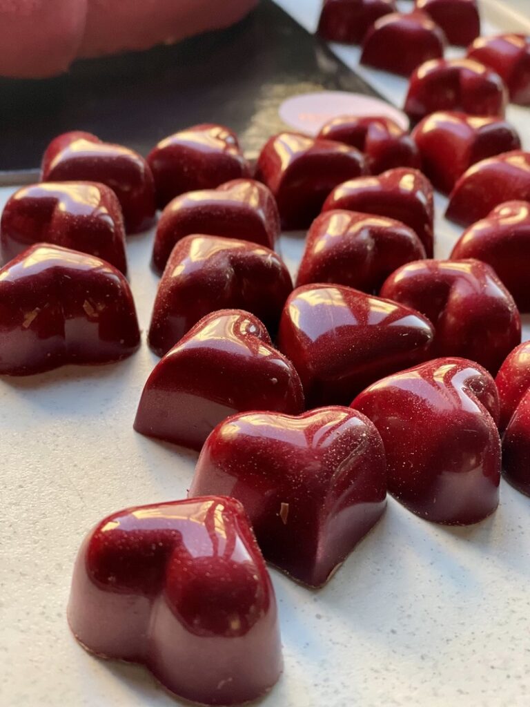 Τη λίστα, ωστόσο, με τις κορυφαίες επιλογές, ειδικά για την ημέρα των Ερωτευμένων, σχεδόν μονοπωλούν οι σοκολάτες και τα σοκολατάκια. «Όλα είναι κόκκινα και σε σχήμα καρδιάς» μου διευκρινίζει «Σοκολατάκια με σοκολάτα γάλακτος (στο κέλυφος) γεμιστά με marshmallows, σοκολατάκια με σοκολάτα ruby και bitter, σοκολατάκια με ganache σοκολάτας με καυτερή πιπεριά (τη sweet Japaneros των The Chili Factor) και σοκολατάκια (αυτή τη φορά, όχι καρδιά) με ganache bitter σοκολάτας και ένα ολόκληρο κεράσι από ποτό κεράσι που έφτιαξε ο αδερφός μου».
